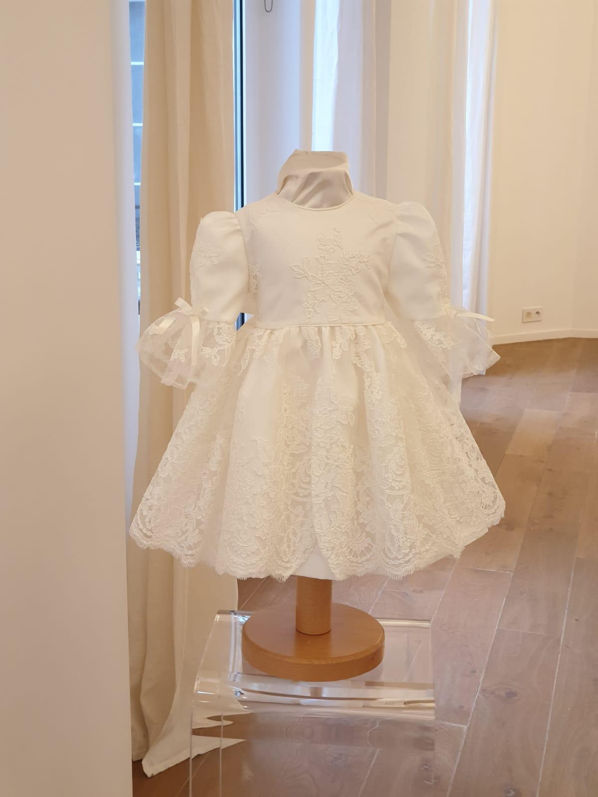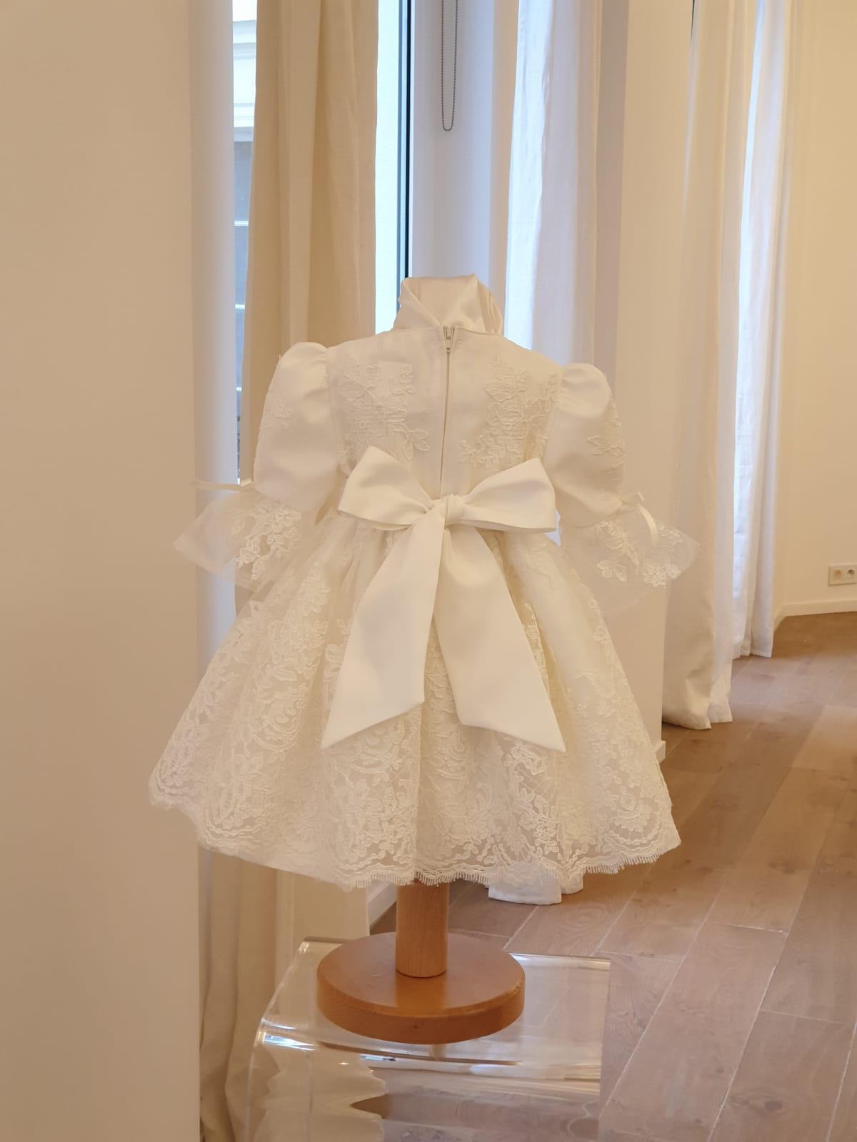 Robe Pompadour 145 euro cette robe de BAPTEME est en dentelle de calais écrue doublée en coton à un jupon de tulle sous la robe elle a un gros noeuds dans le dos elle est fabriquée en France dans notre atelier parisien