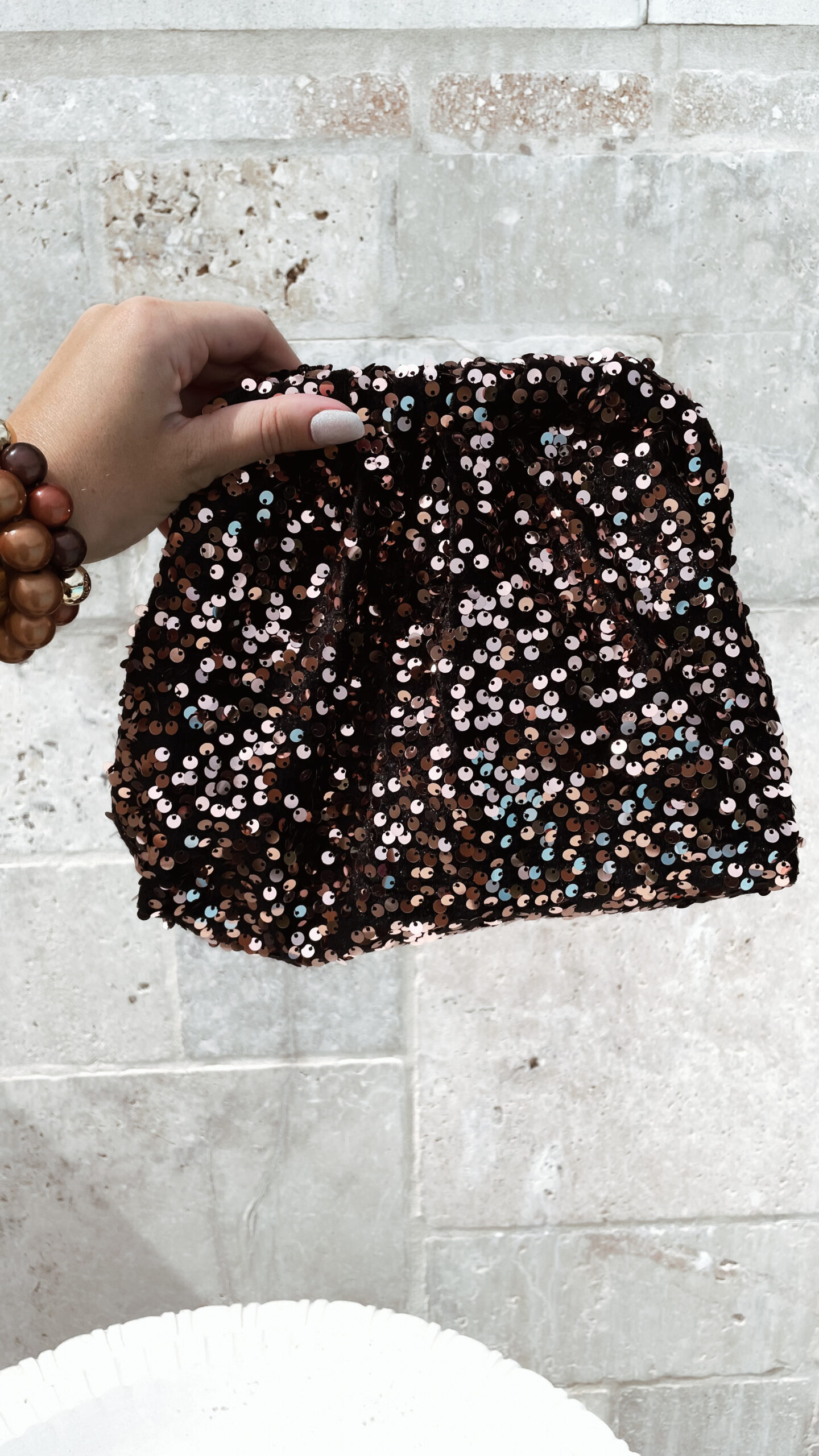 -Sac en sequins chocolat, doublure à l’intérieur.