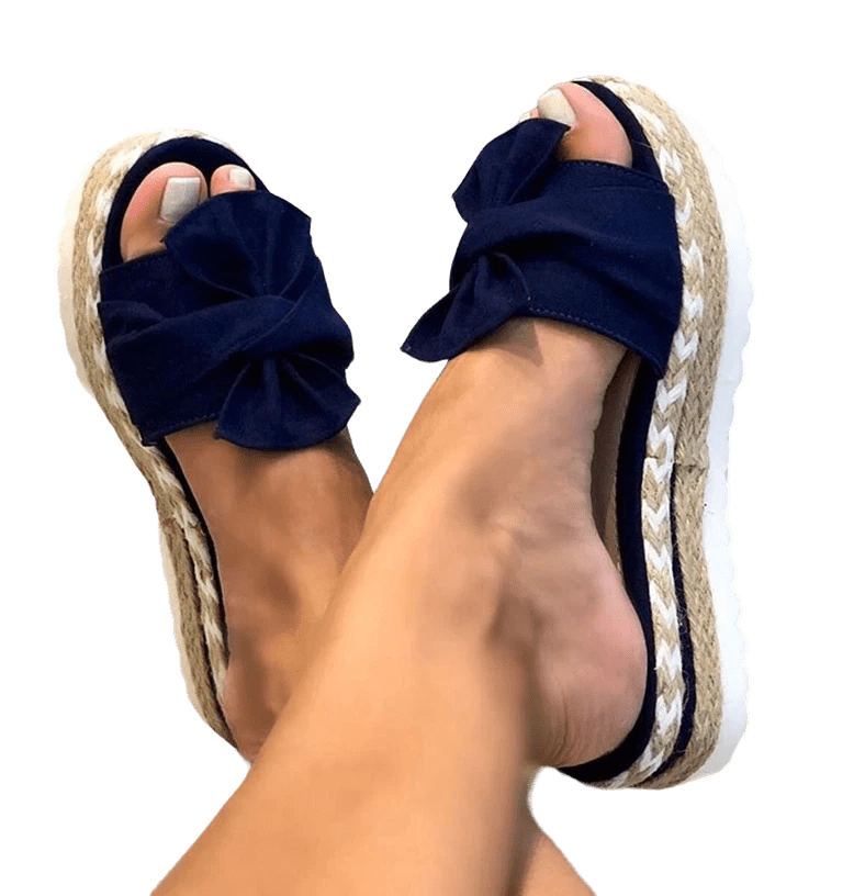 - joli look avec la plateforme en tissu tressé de type osier entrecoupée de la couleur bleu marine dominante