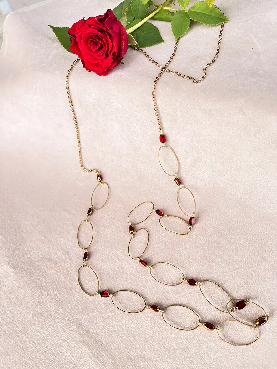 Avec son jeu subtil de rouge profond et d’éclats dorés, ce collier sautoir vous permet d’accessoiriser une tenue sobre ou apporter une touche de raffinement à un look de soirée, il sera votre allié parfait pour une allure chic et distinguée.