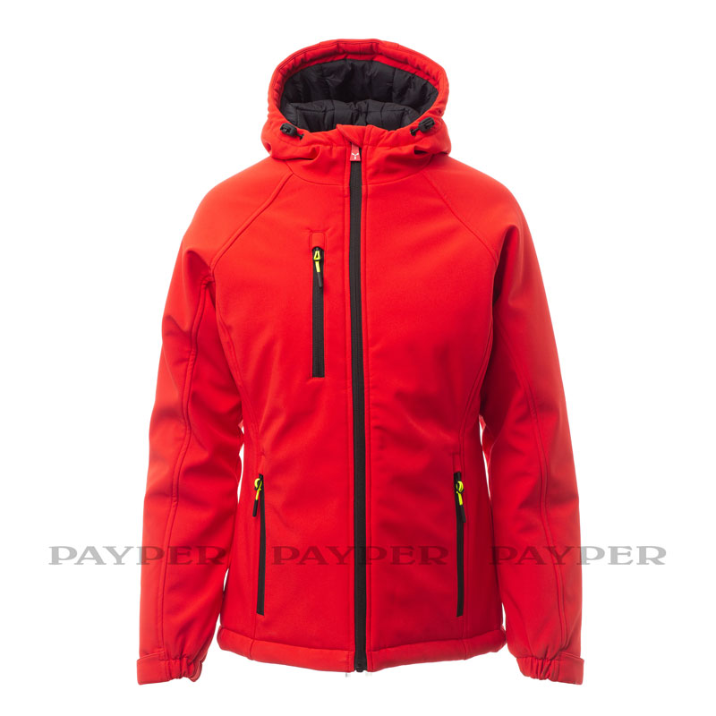 Soft-shell rembourré pour femme, fermeture par zip avec curseur en métal à verrouillage semi-automatique et tirette personnalisée.