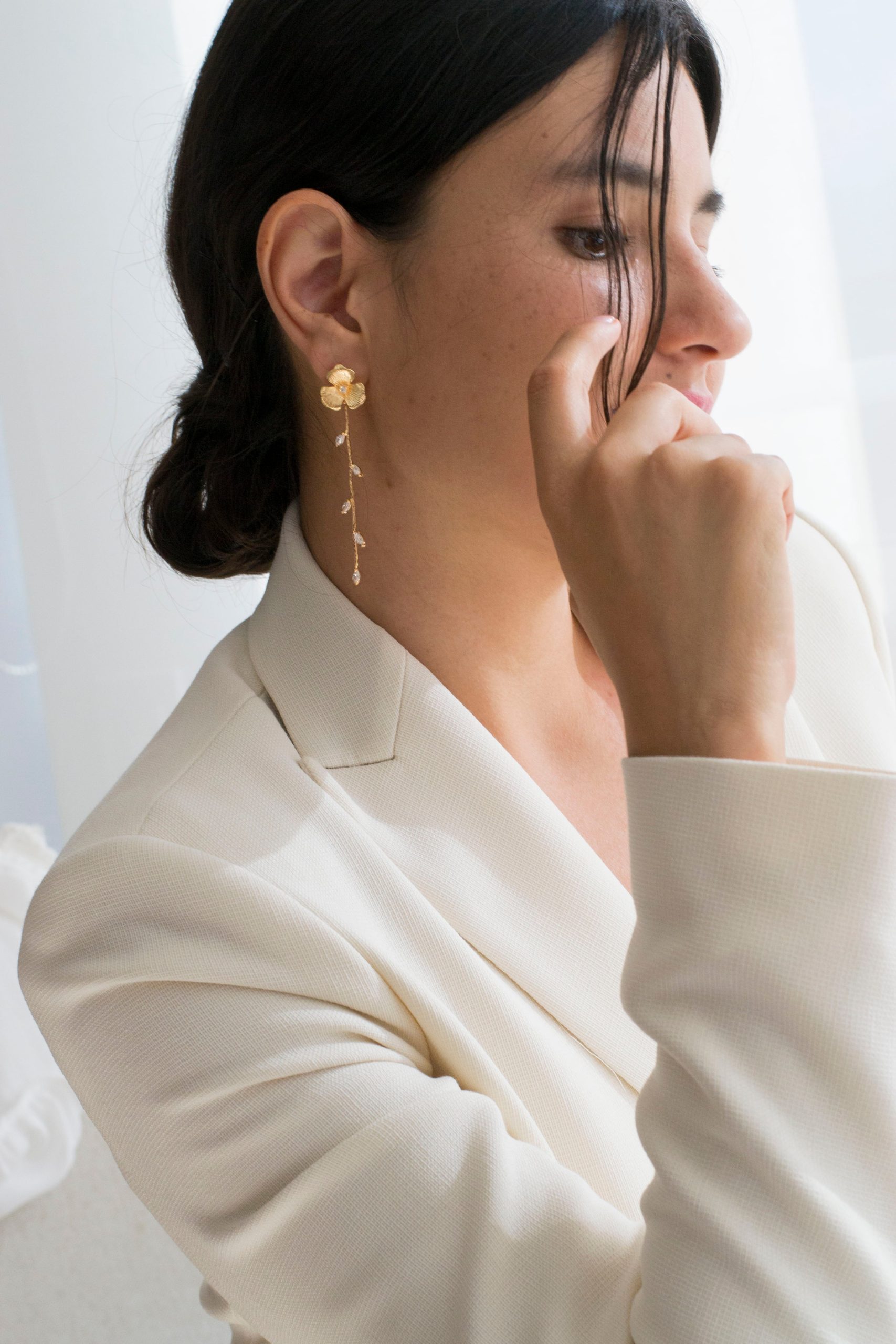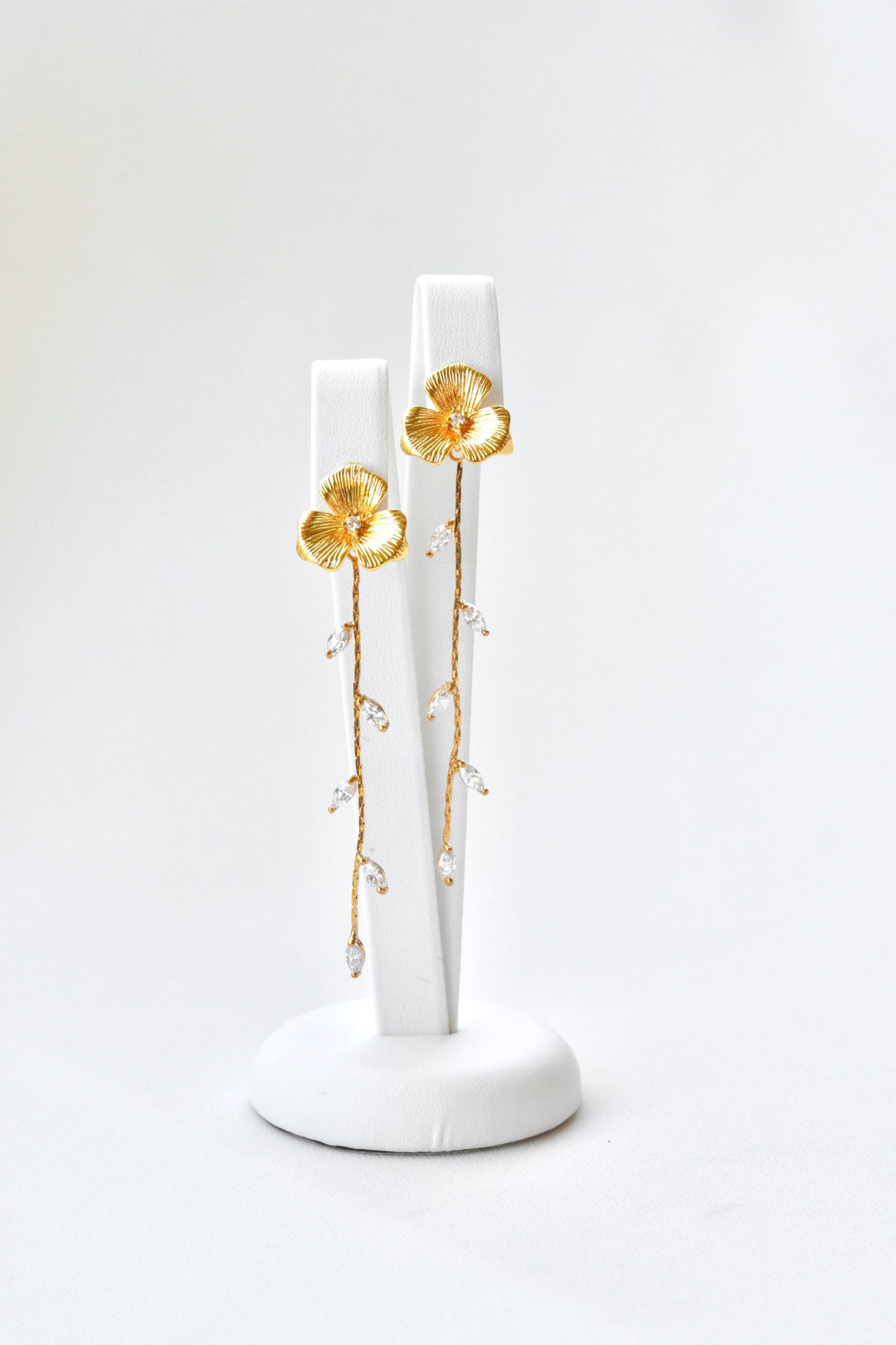 Ces boucles d’oreilles pendantes élégantes ont été fabriquées avec deux fleurs fines et délicates décorées d’un mini zircon au milieu. De chaque fleur pend une chaine dorée ornée de petits zircons en forme de gouttes. Toutes les pièces dorées de ces accessoires sont faites en métal recouvert d’un bain d’or de 24k.