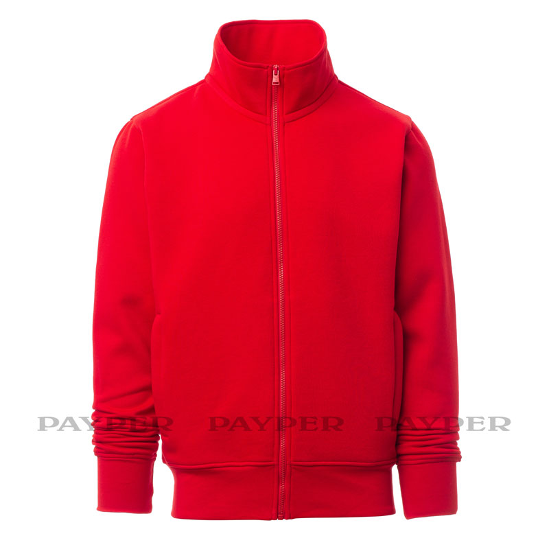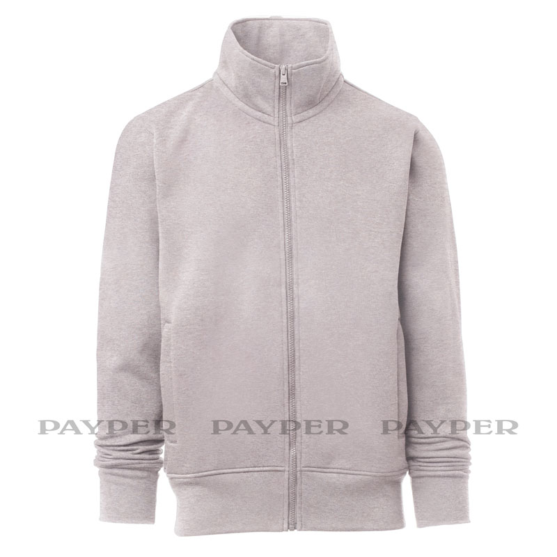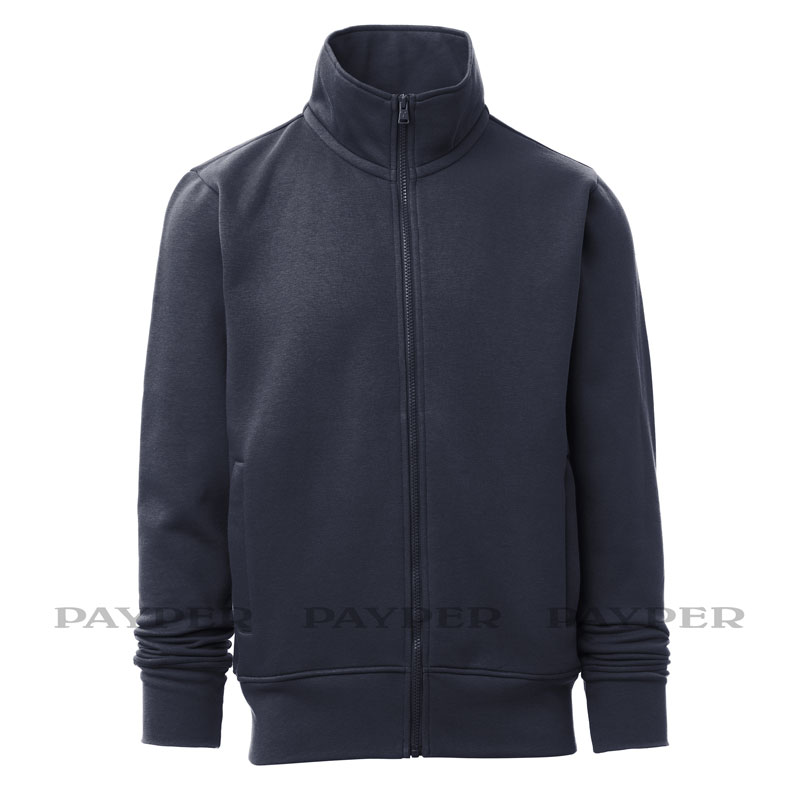 Sweat-shirt pour homme, zip intégral en plastique assorti avec curseur simple personnalisé, manches montées, deux poches passepoilées avec zip, poignets et taille en bord côtes élastique, coutures renforcées, ruban de renfort intérieur col assorti.