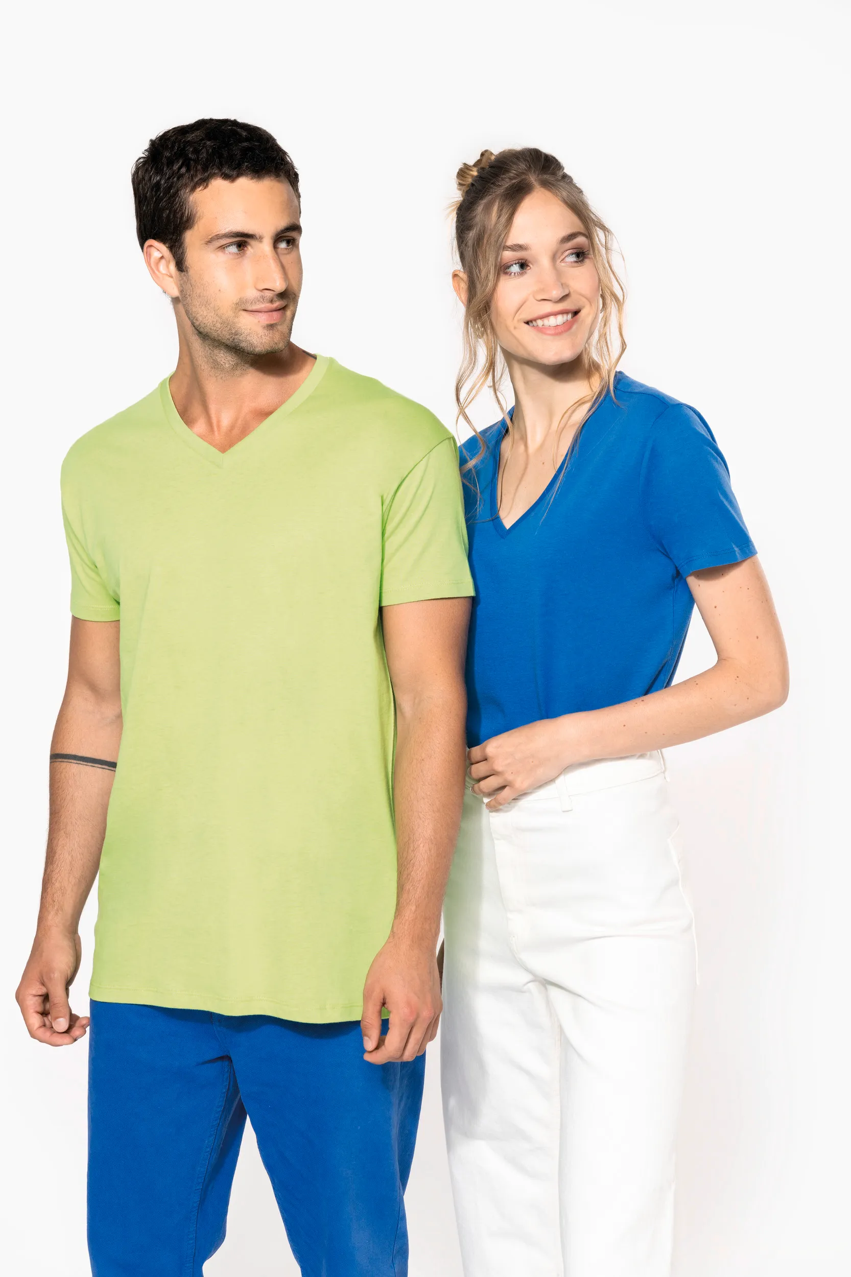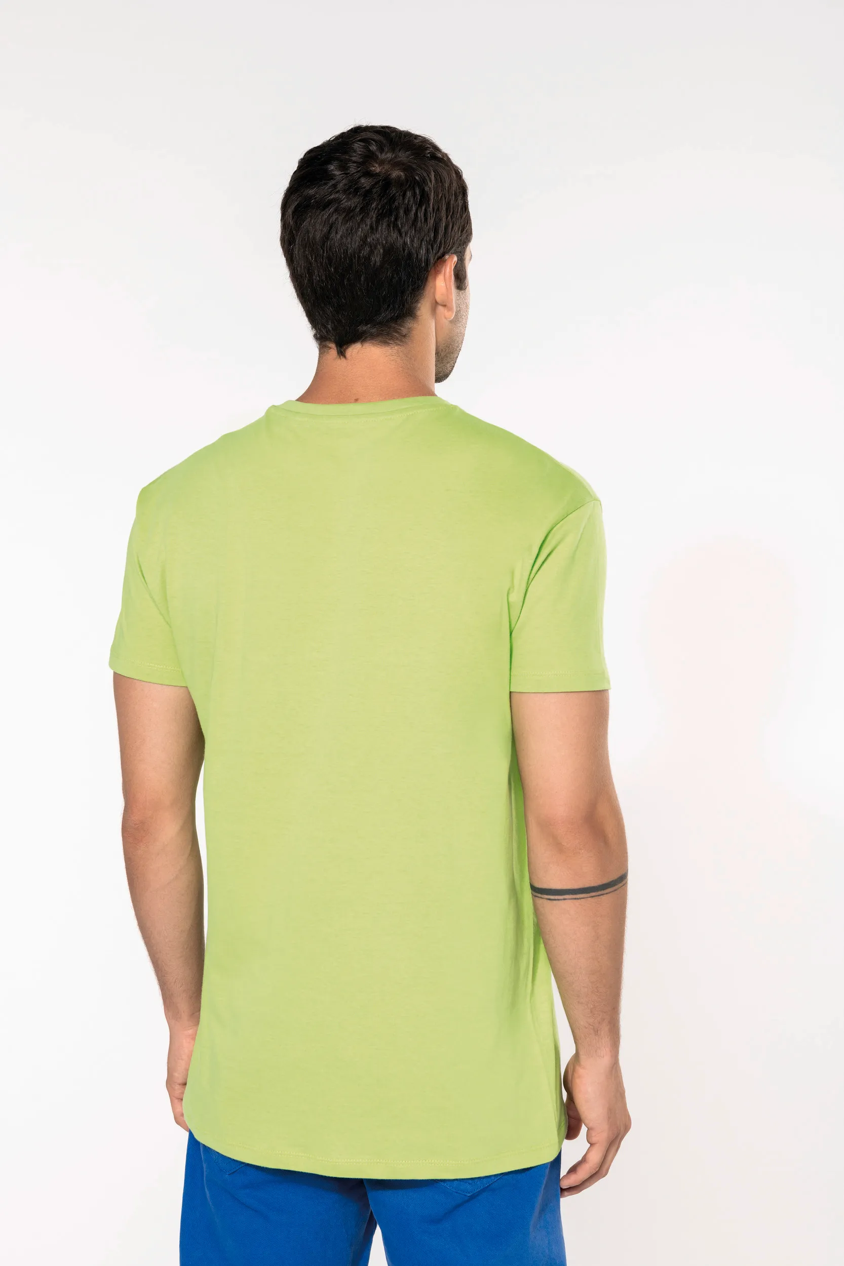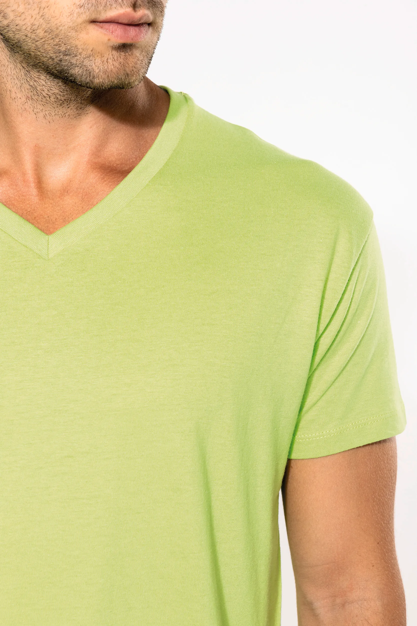 Coloris unis : 100% coton. Coloris Ash Heather : 98% coton / 2% viscose. Coloris Oxford Grey : 90% coton / 10% viscose. Tous les coloris sont fabriqués à partir de coton en conversion biologique. Coton peigné. Encolure en V en bord-côte avec élasthanne. Bande de propreté ton sur ton à l’encolure. Tubulaire. Finition double aiguille bas de manches et bas de vêtement.