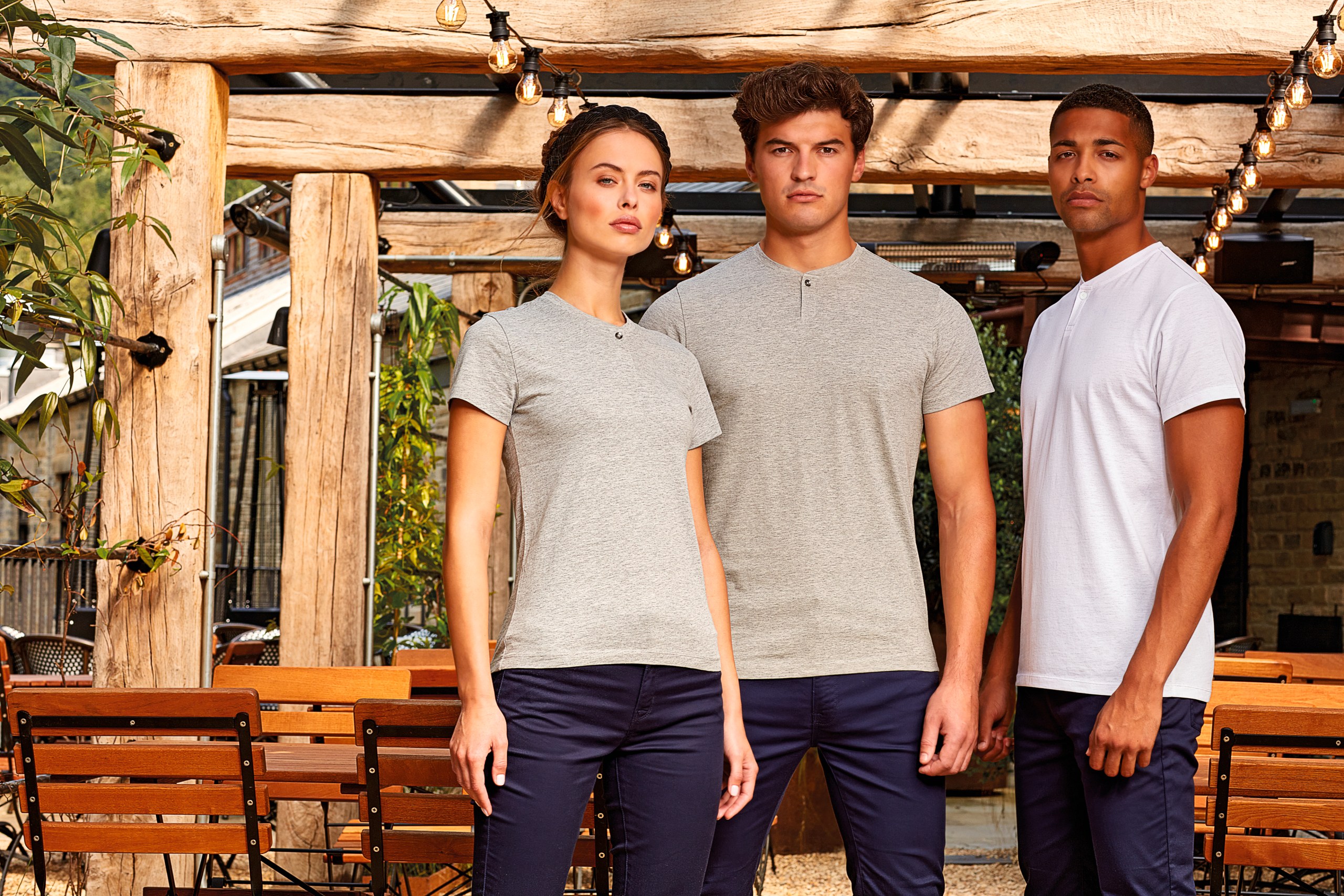 60% Coton / 40% Polyester. Coton issu du développement durable et polyester recyclé à partir de plastique post-consommation. T-shirt à manches courtes. Col rond avec patte de boutonnage. Toucher doux.