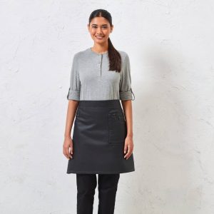 65% polyester / 35% coton sergé. Tablier mi-long. Cordons dans le même tissu que le tablier, longueur de 90 cm. Dimensions : H50cm x L70cm. Lavage domestique 60°C. Lavage industriel 85°C.