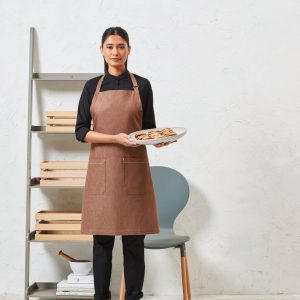 65% polyester / 35% coton sergé. Cordons dans le même tissu que le tablier. Poche centrale. Poche stylos intégrée. Largeur 90 cm. Longueur 80 cm. Longueur des cordons 90 cm. Lavage industriel 85°C. Lavage domestique 60°C.