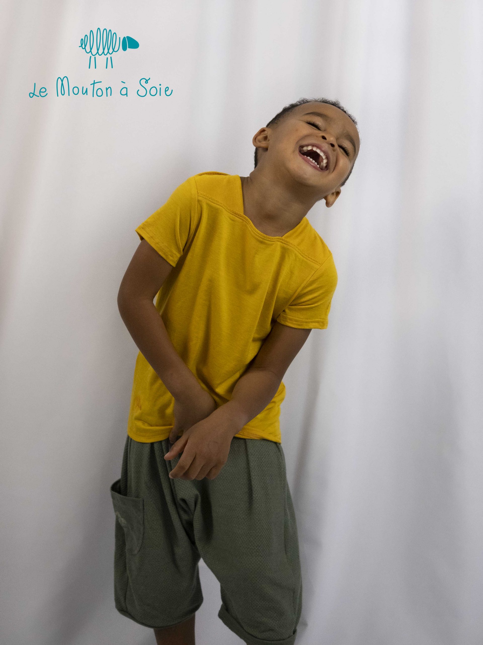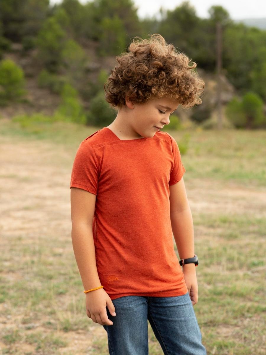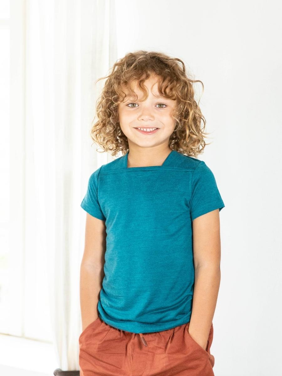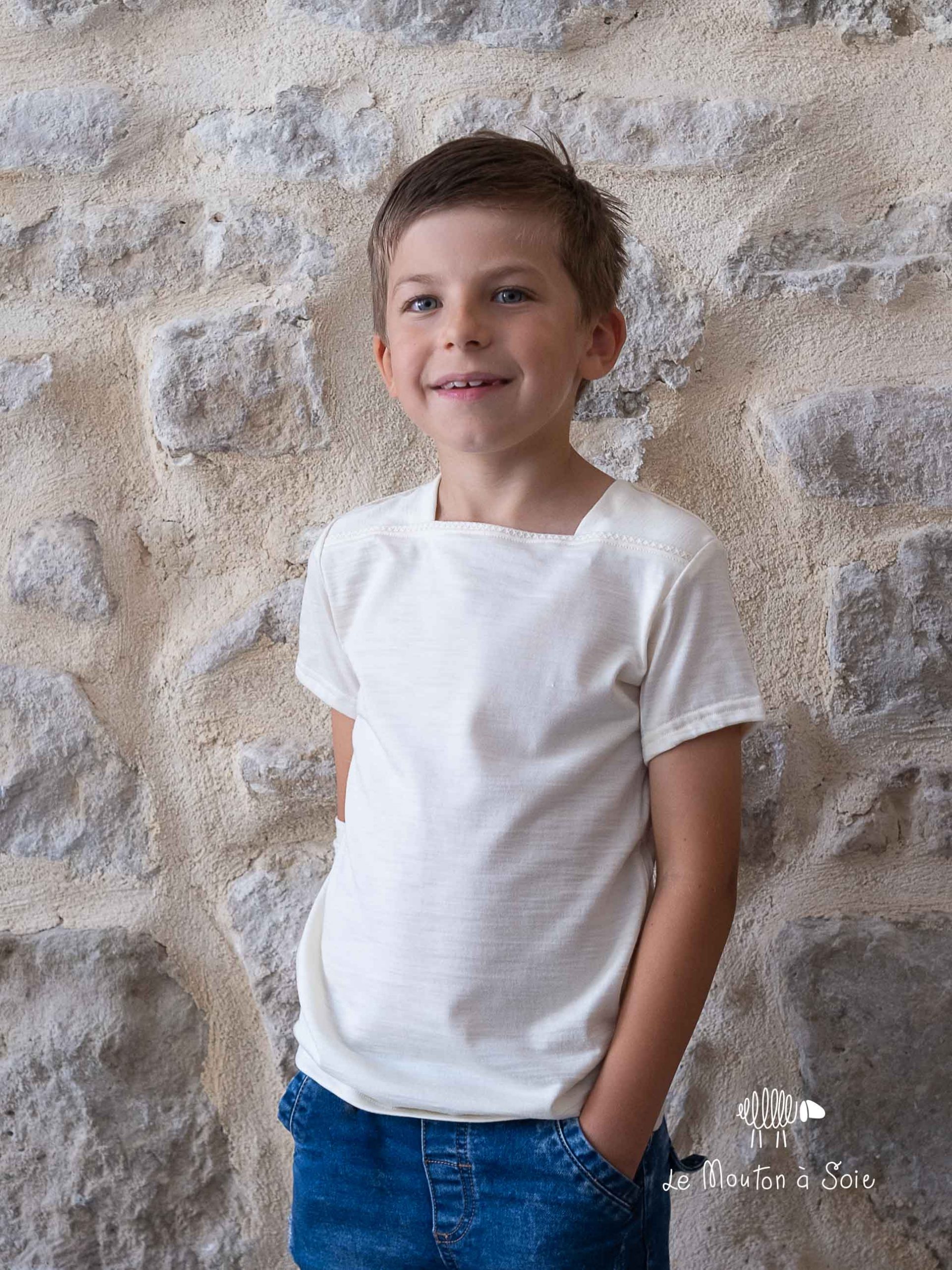 Avec son encolure bateau originale, notre tee-shirt manches courtes enfant Petit Mousse en laine mérinos bio et soie a cette petite touche qui fait la différence !