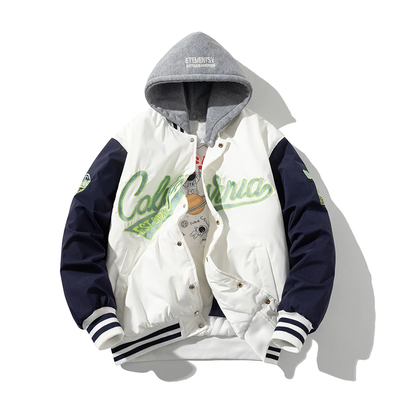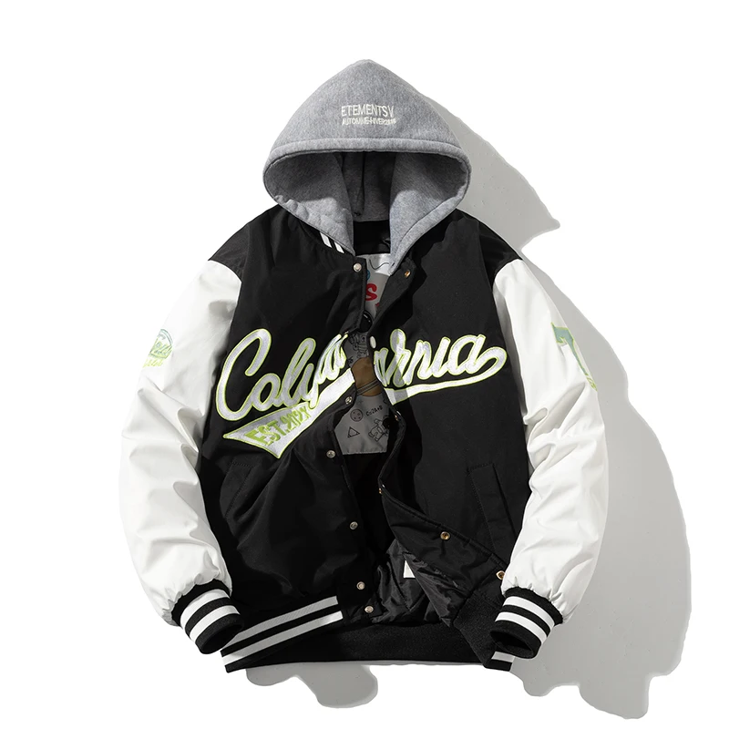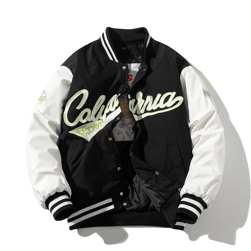 La veste se distingue par ses broderies détaillées et son inscription "California", évoquant l’esprit sportif et universitaire.
