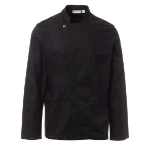Veste de cuisine homme à col mao, réalisée en twill de coton et Lycra® T400®, avec d’excellentes propriétés élastiques et respirantes.