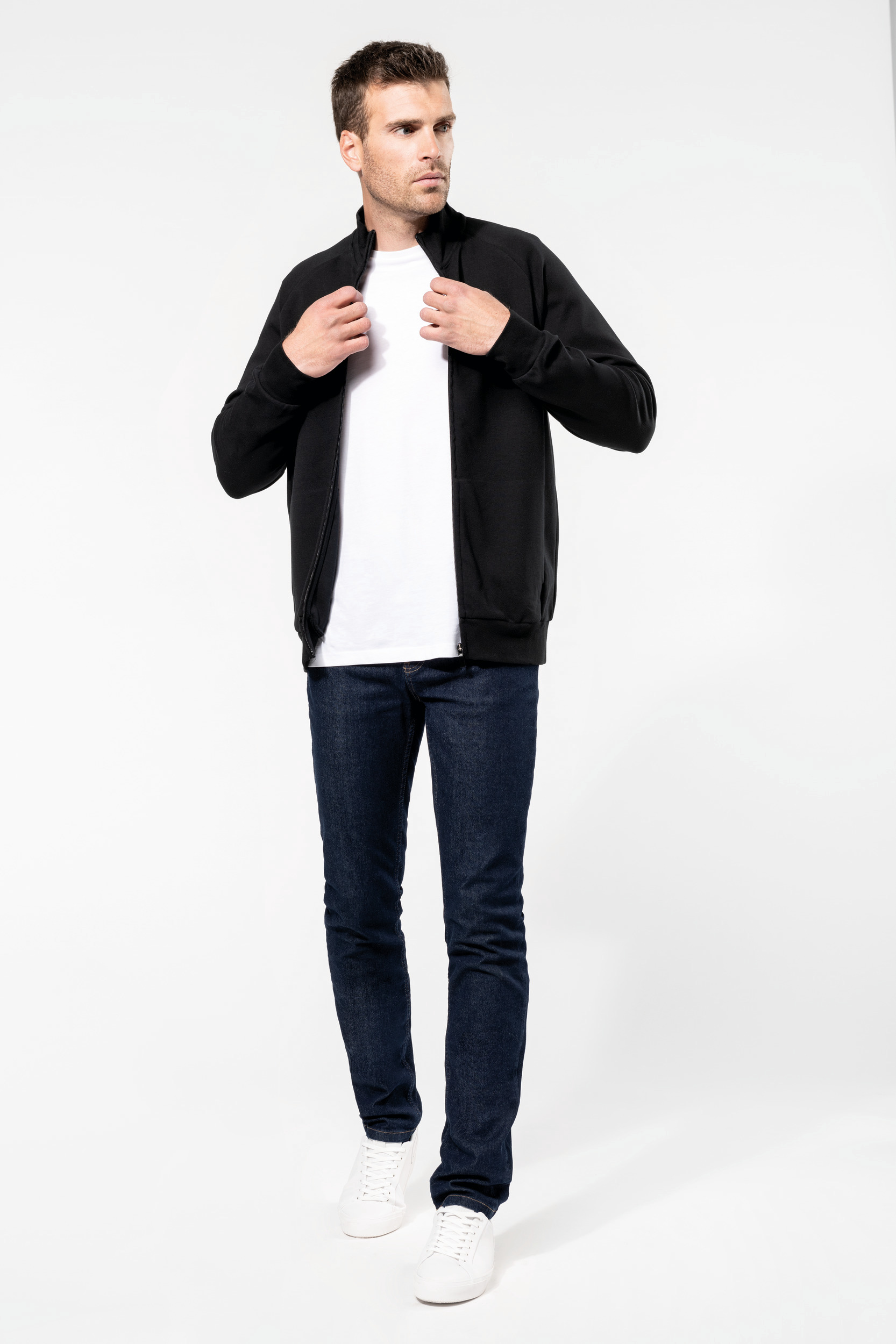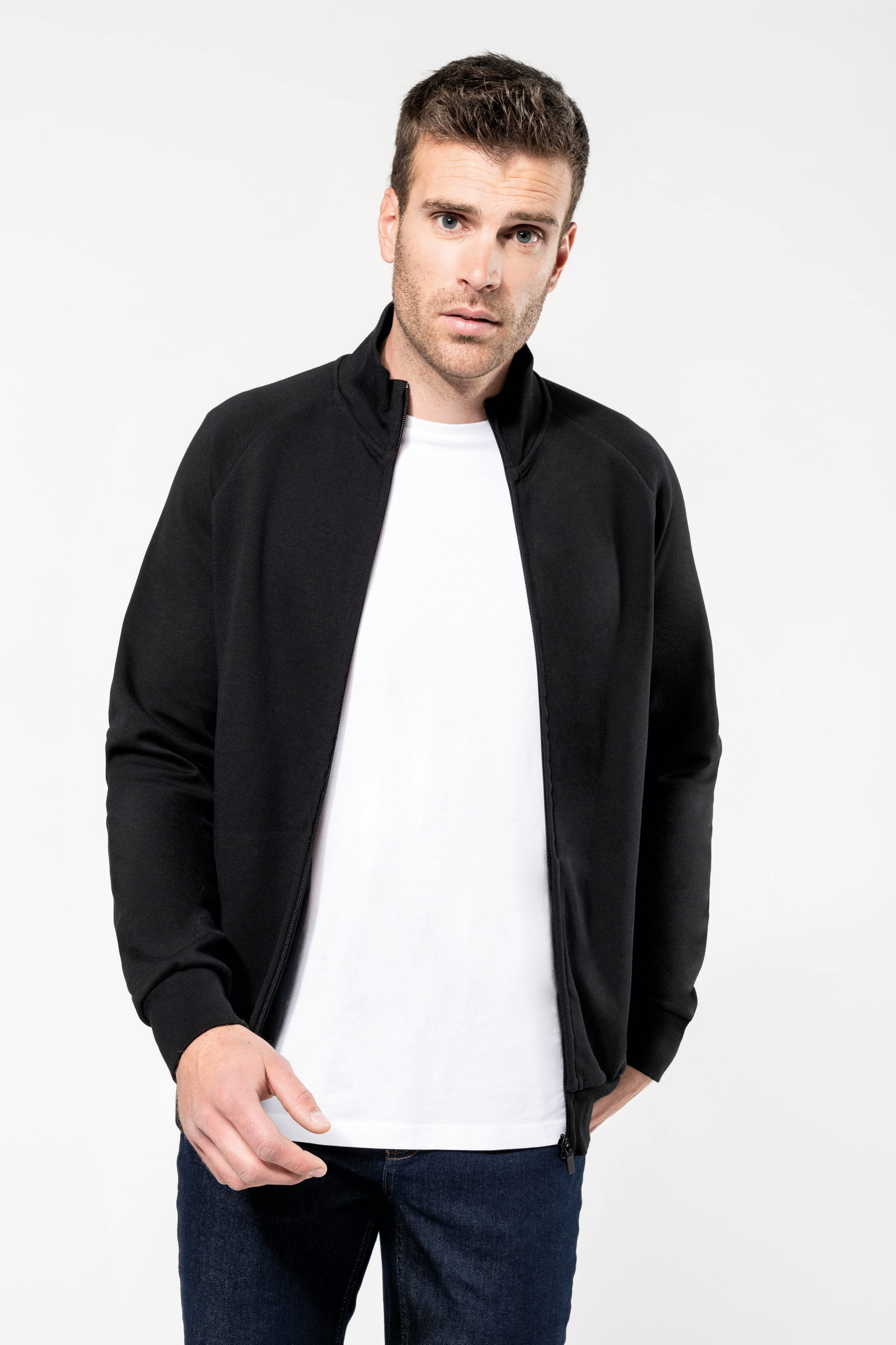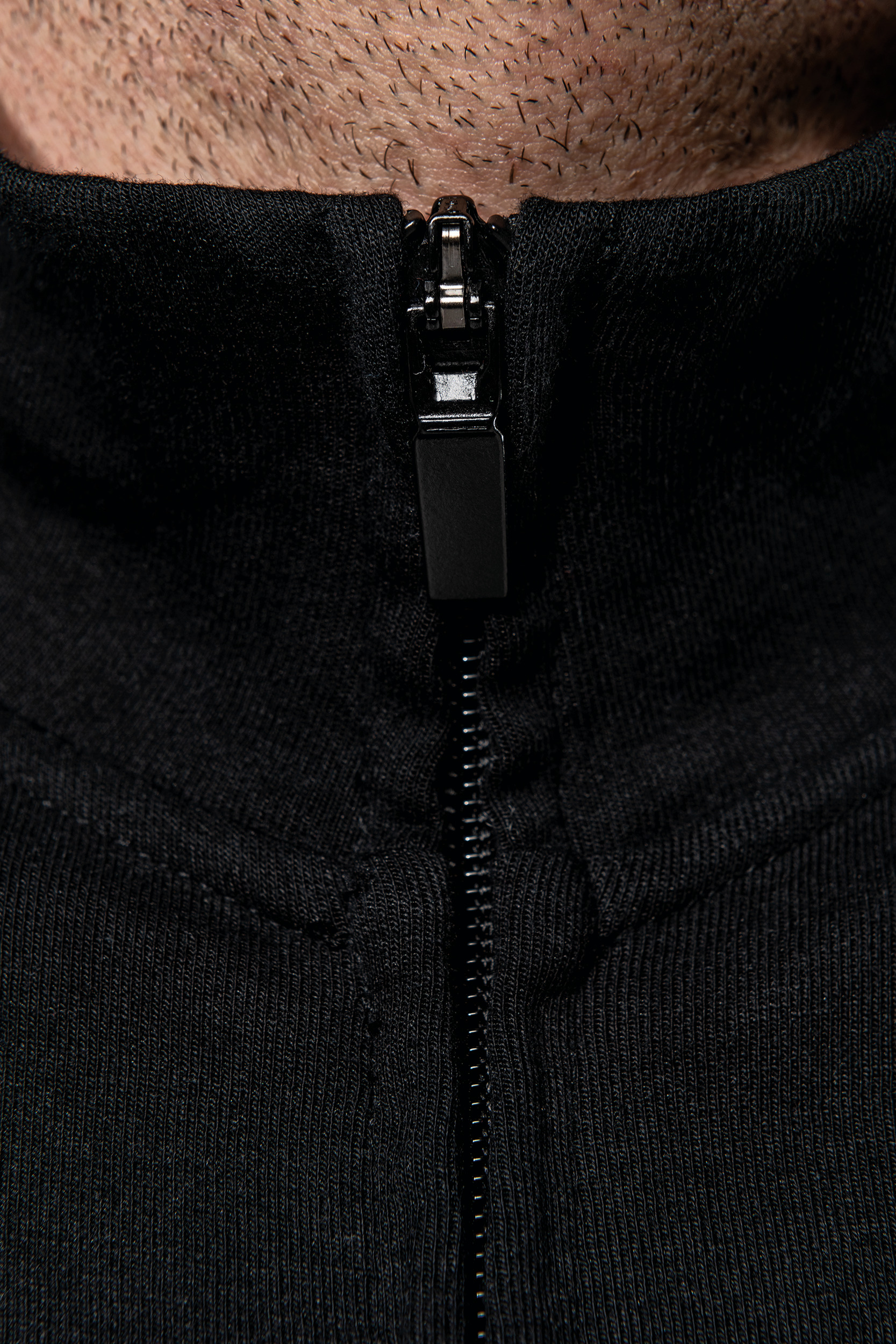 70% coton / 26% polyester / 4% élasthanne. Coton peigné. Tissu interlock. Traitement LSI (Low Shrinkage Interlock). Surpiqûres au col. Bande de propreté sur l’encolure intérieure. Zip nylon ton sur ton avec zipper métal et finition bande de propreté à l’intérieur. Manches raglan. Rib 1×1. 2 poches prisent dans la couture de l’empiècement. Pas d’étiquette de marque, uniquement une puce de taille pour faciliter la personnalisation.