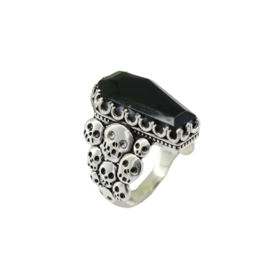 Bague gothique en métal avec pierre noire et crânes – Anneau punk rock homme / femme