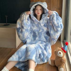 Pull plaid bleu à capuche avec imprimés d’ours blancs