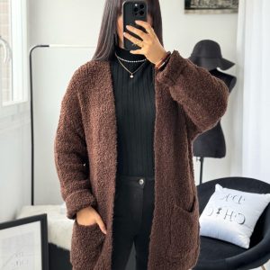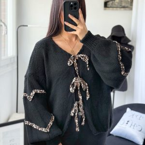 Gilet Mi-Long Laine à Nouer Noir Léopard