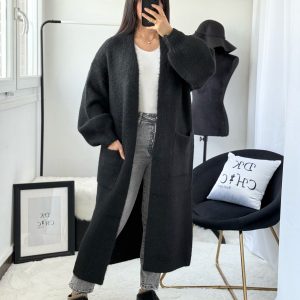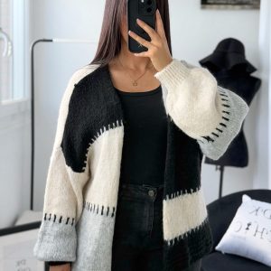 Gilet Mi-Long Laine Multicolore Noir Gris Blanc