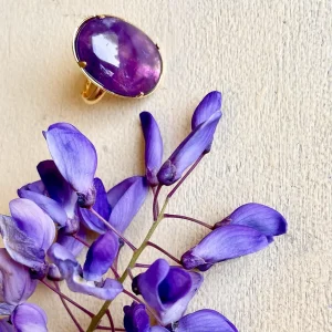 Cette bague dorée peut se porter en accumulation avec d’autres bagues.
