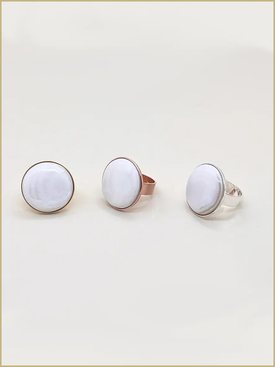 Cette bague se distingue par son grand disque de nacre, légèrement bombé, qui habille la main à lui seul avec élégance.