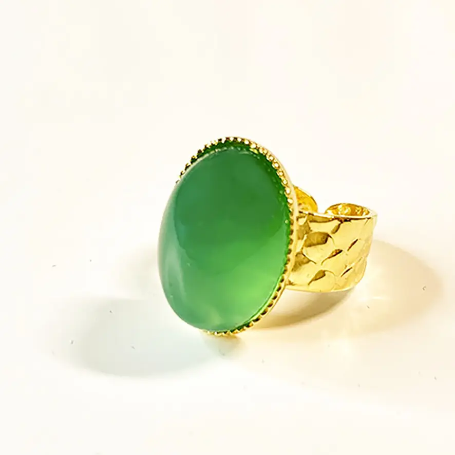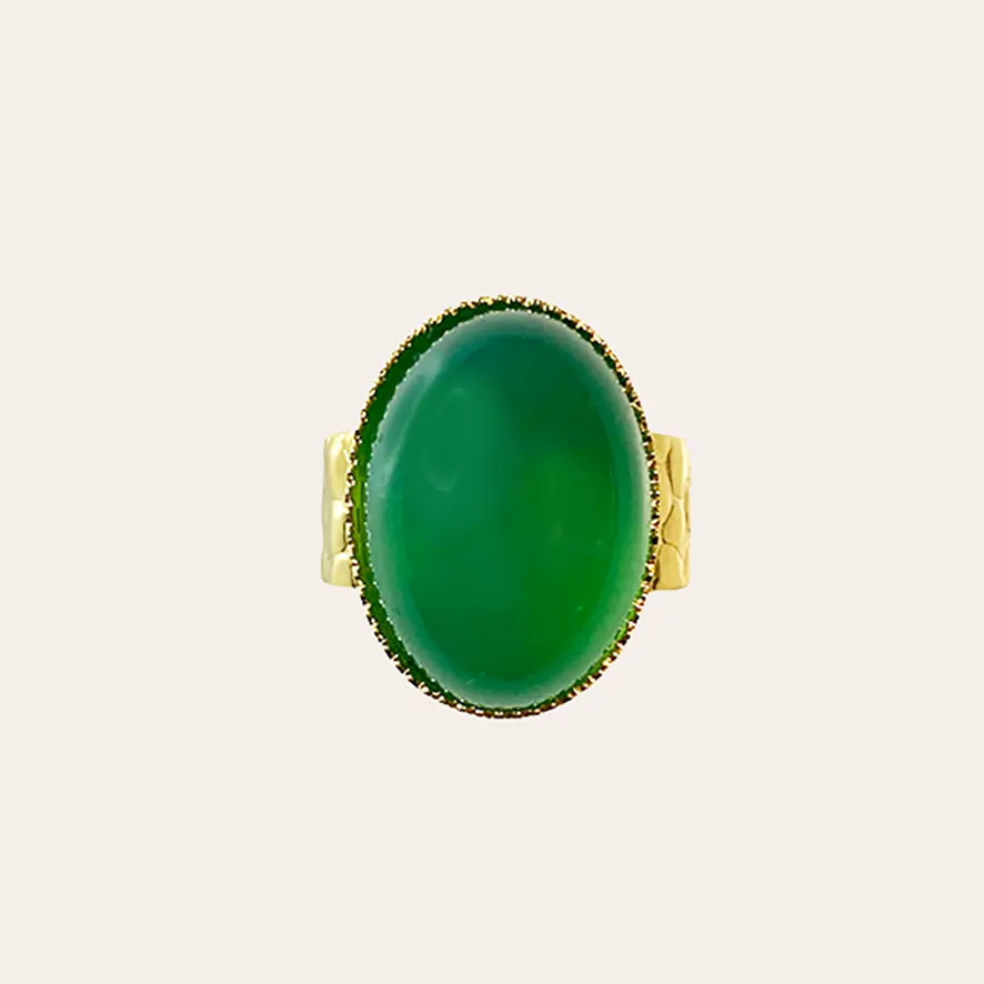 Bague en laiton doré à l’or fin avec un cabochon en pierre naturelle d’onyx d’une magnifique couleur verte.