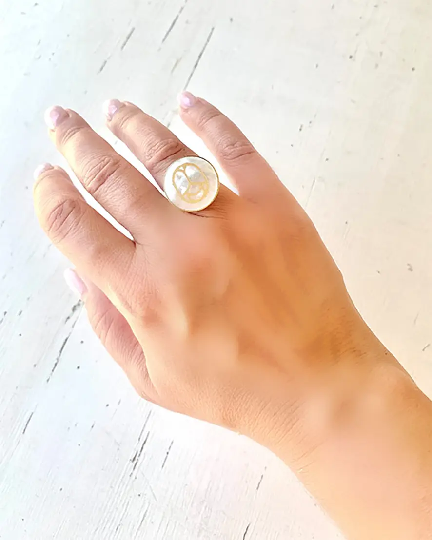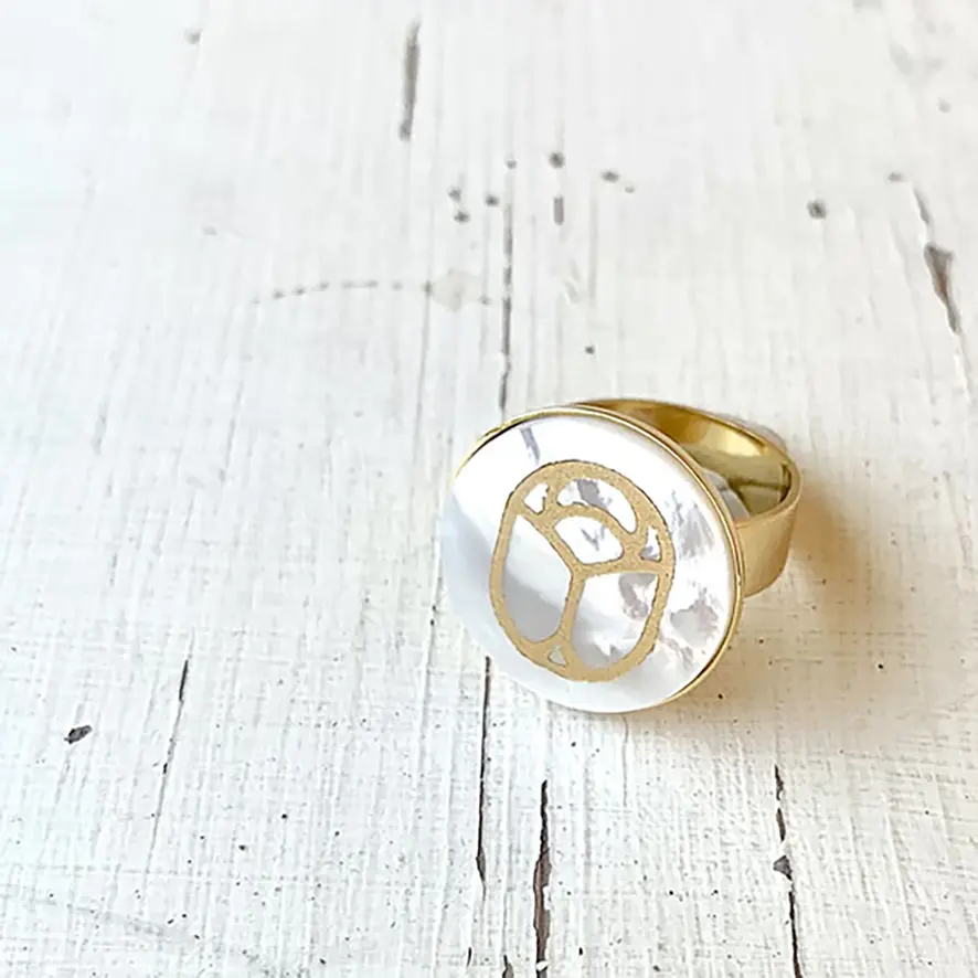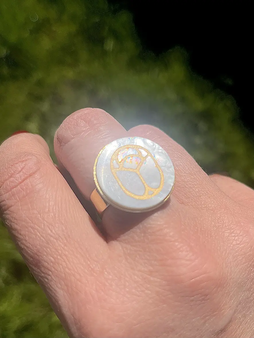 Portez un symbole de bonheur à votre doigt avec ce scarabée gravé or sur un disque de nacre.
