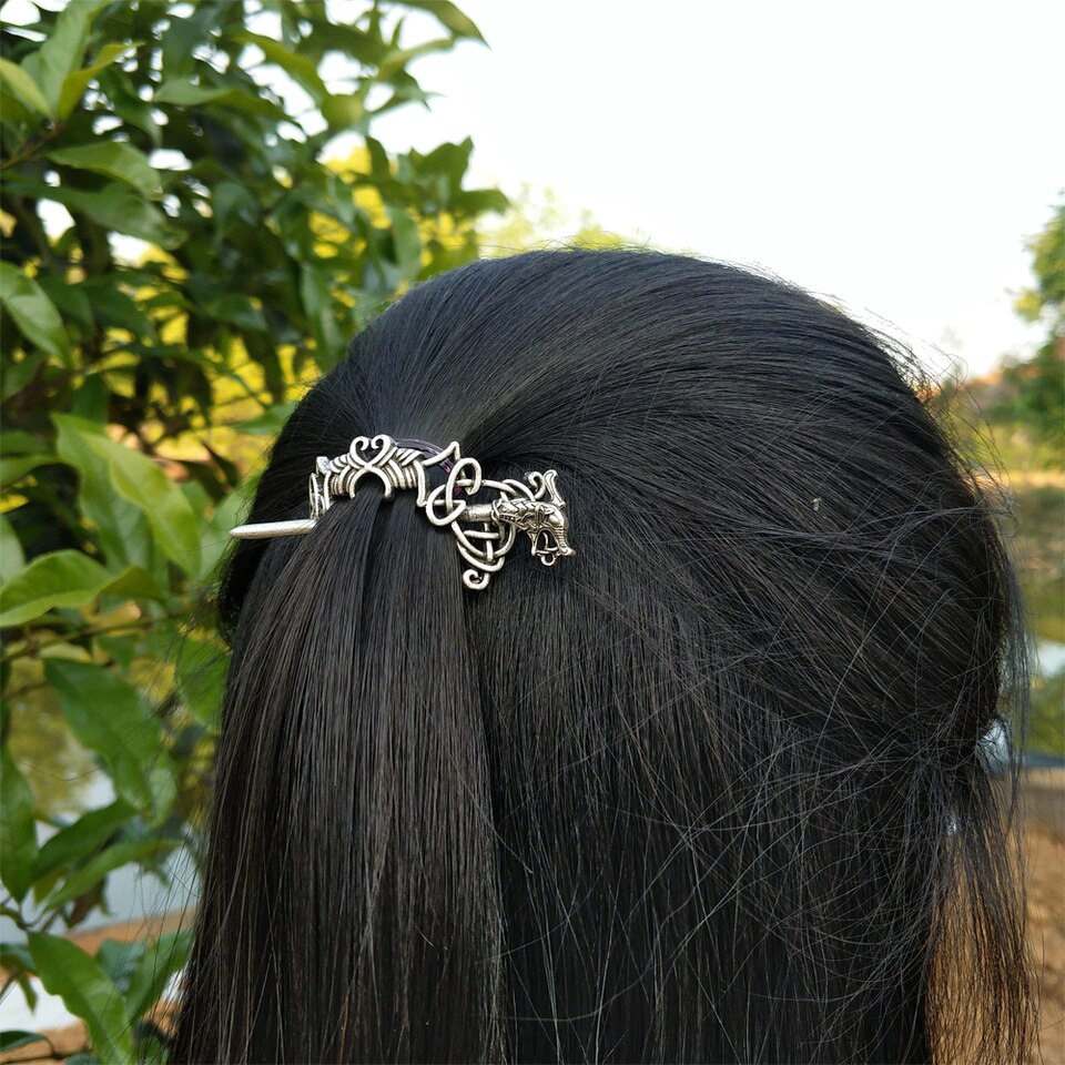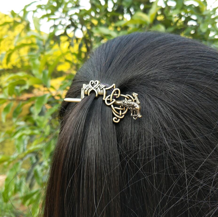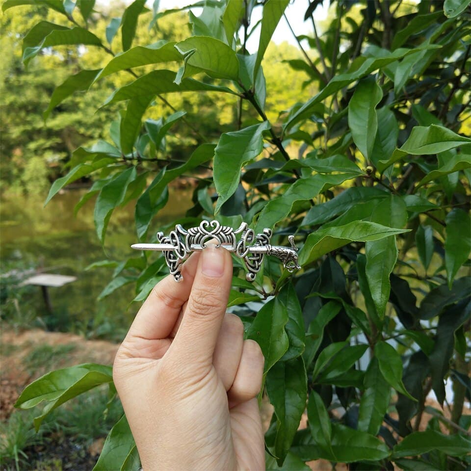 Découvrez la puissance et le charme du formidable Bijou cheveux Viking motif entrelacs celtes. Un bijou à la fois robuste et élégant, disponible en bronze ou en argenté, sculpté à partir d’un alliage solide de zinc. A la fois gracieux et audacieux, ce bijou de 25mm x 70mm donne une aura unique à celui qui le porte.
