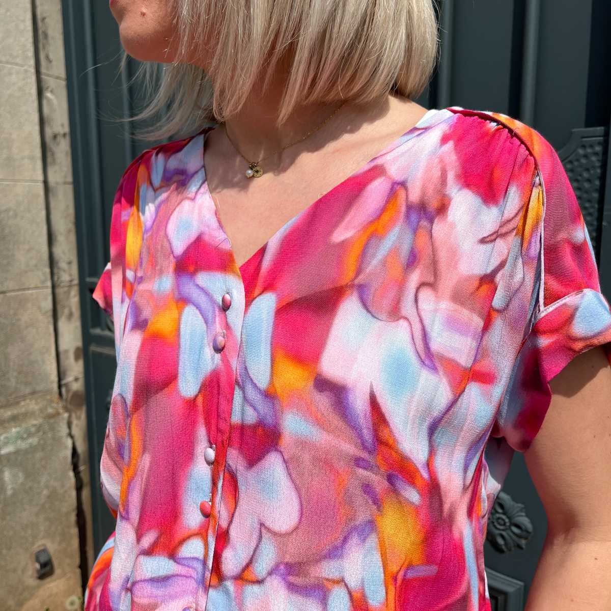 Optez pour des looks ultra colorés avec cette blouse imprimé rose. La blouse imprimé rose est une blouse à courtes manches avec un joli col V très féminin.
