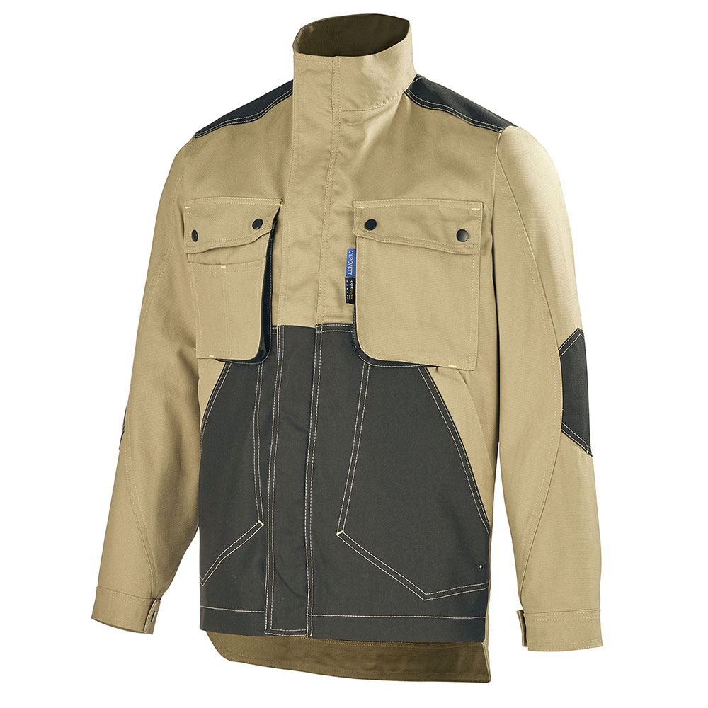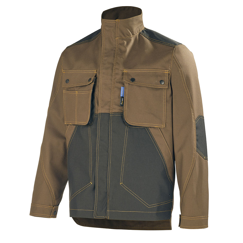 Col montant fermé par pressions. Fermeture à glissière sous-patte. 2 poches poitrine à soufflet et rabats fermés dont une avec surpoche. 2 poches basses. Bas du dos plus long. Système de fixation intérieur pour recevoir un gilet polaire amovible. Poignets rapportés fermés par pression. Mercerie tout plastique.