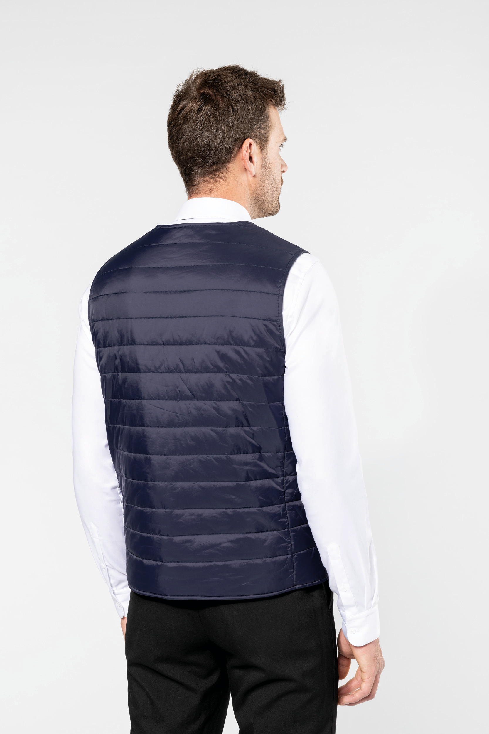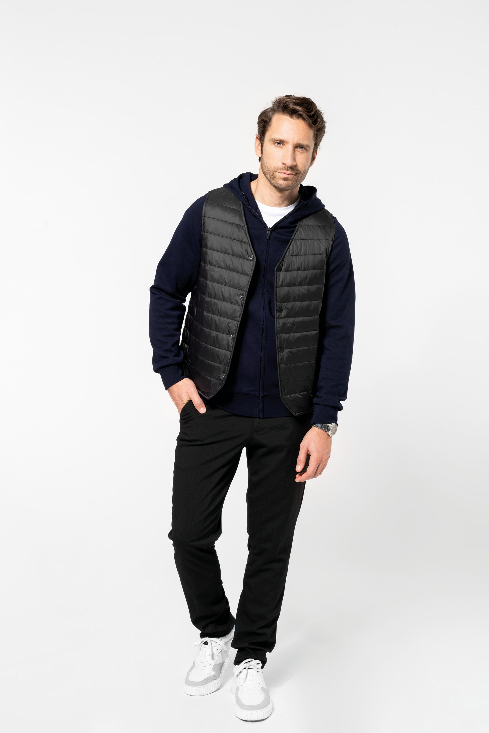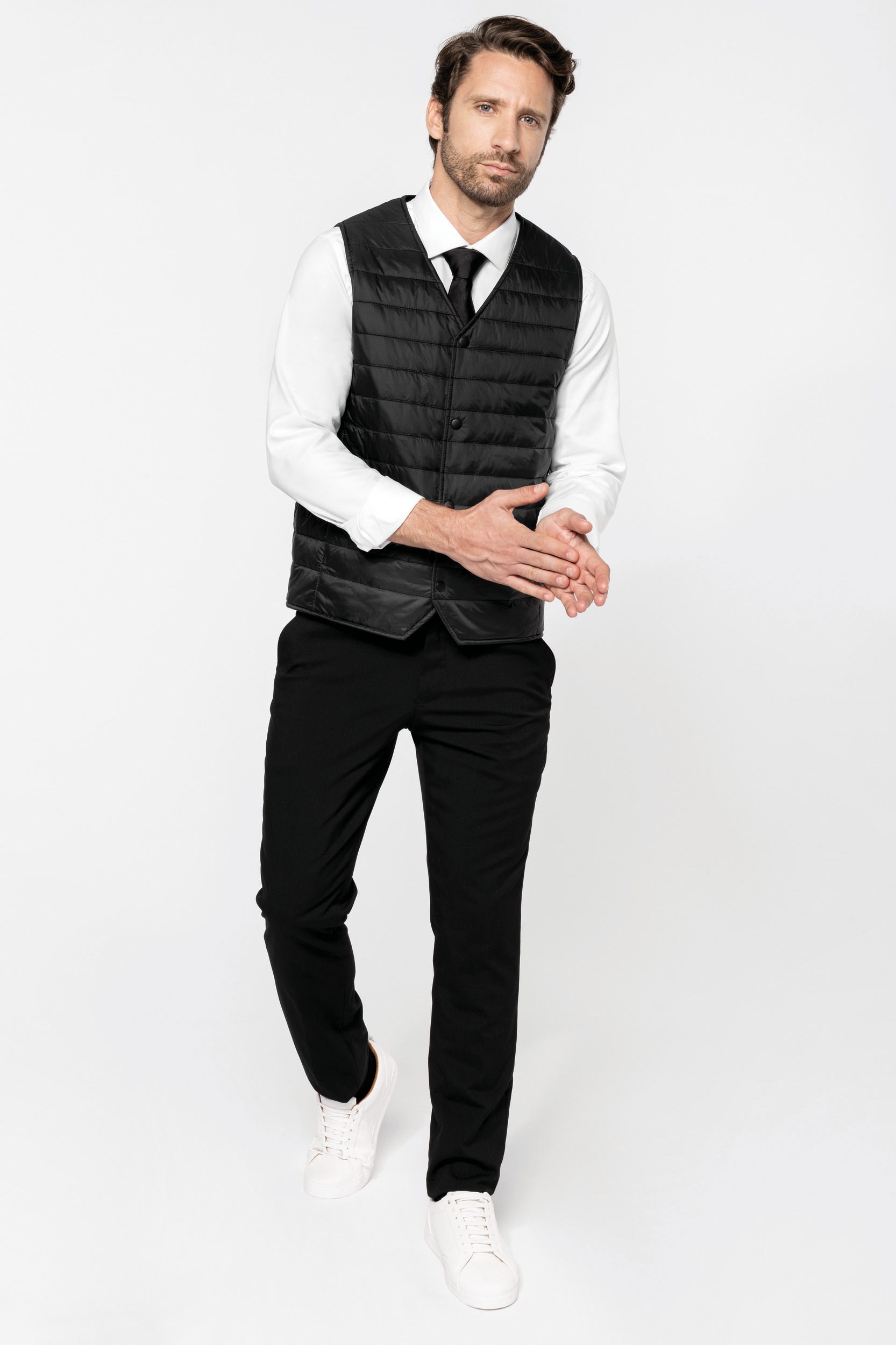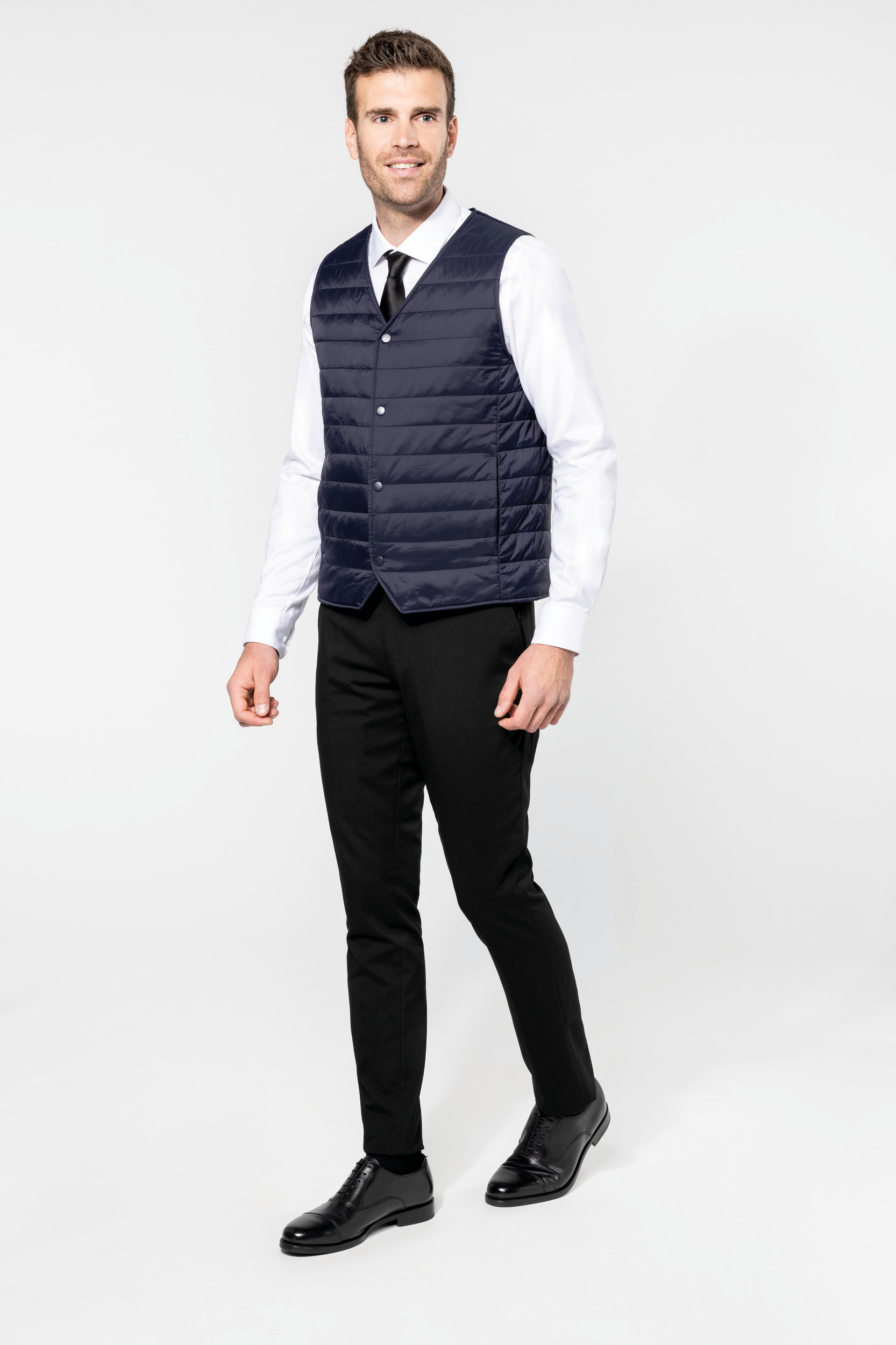 100% polyamide. Rembourrage intérieur en Thinsulate™. 2 poches côtés. Fermeture boutons pressions ton sur ton. Zip de personnalisation côté gauche. Très fin afin de pouvoir le porter sous une veste. Pas d’étiquette de marque, uniquement une puce de taille pour faciliter la personnalisation.
