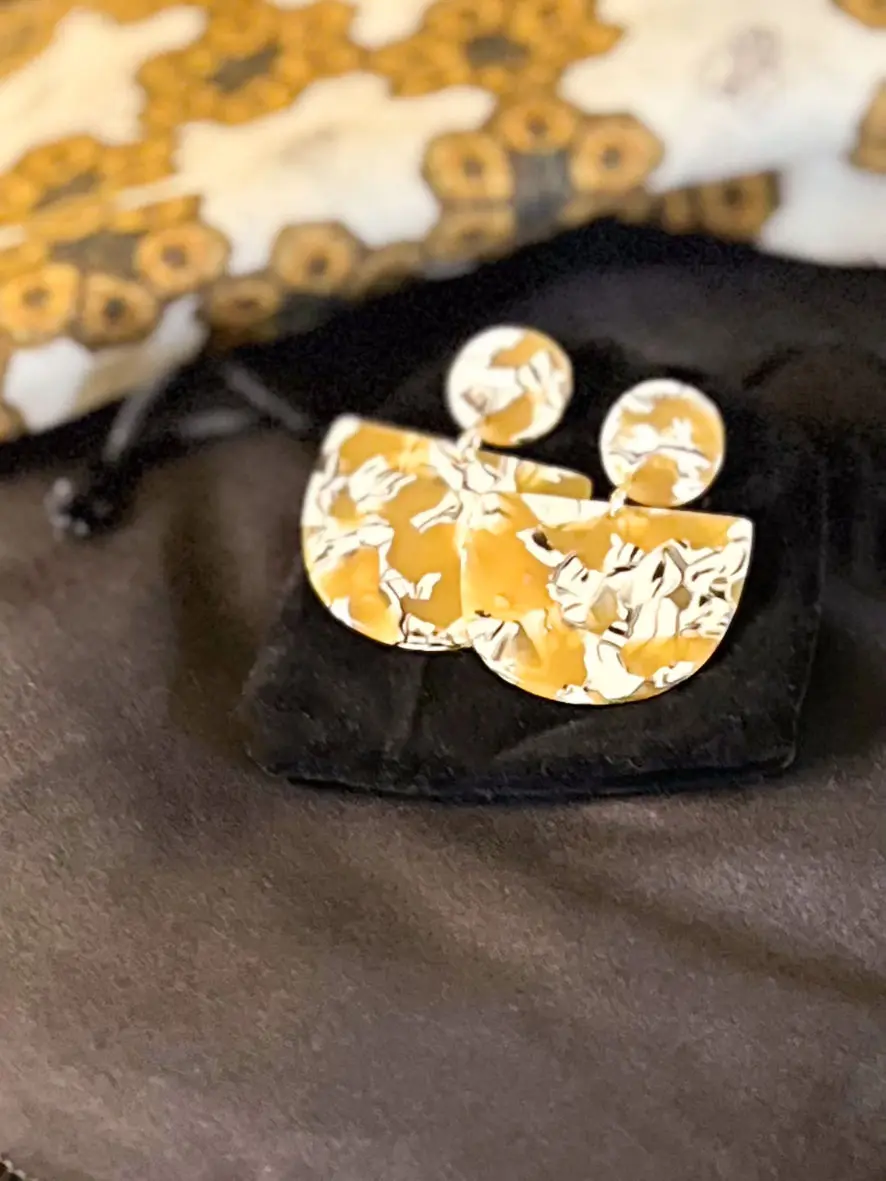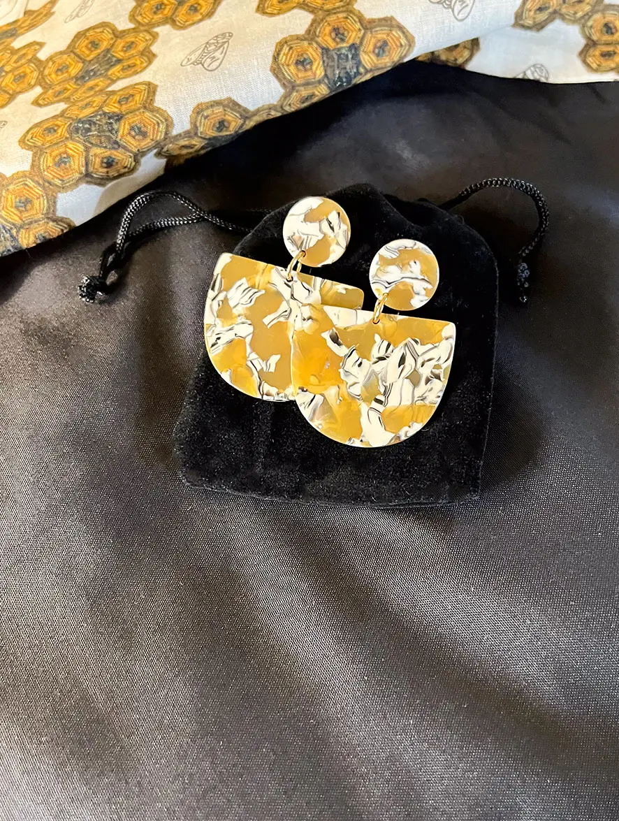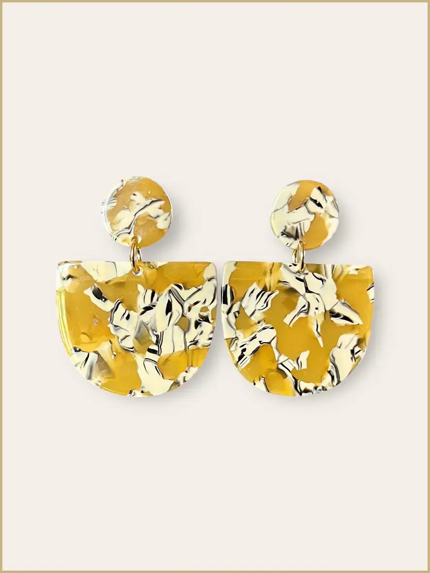 Une touche chic et tendance pour ces boucles d’oreilles avec une demi-lune en acétate aux nuances de ocre, crème, beige et noir.