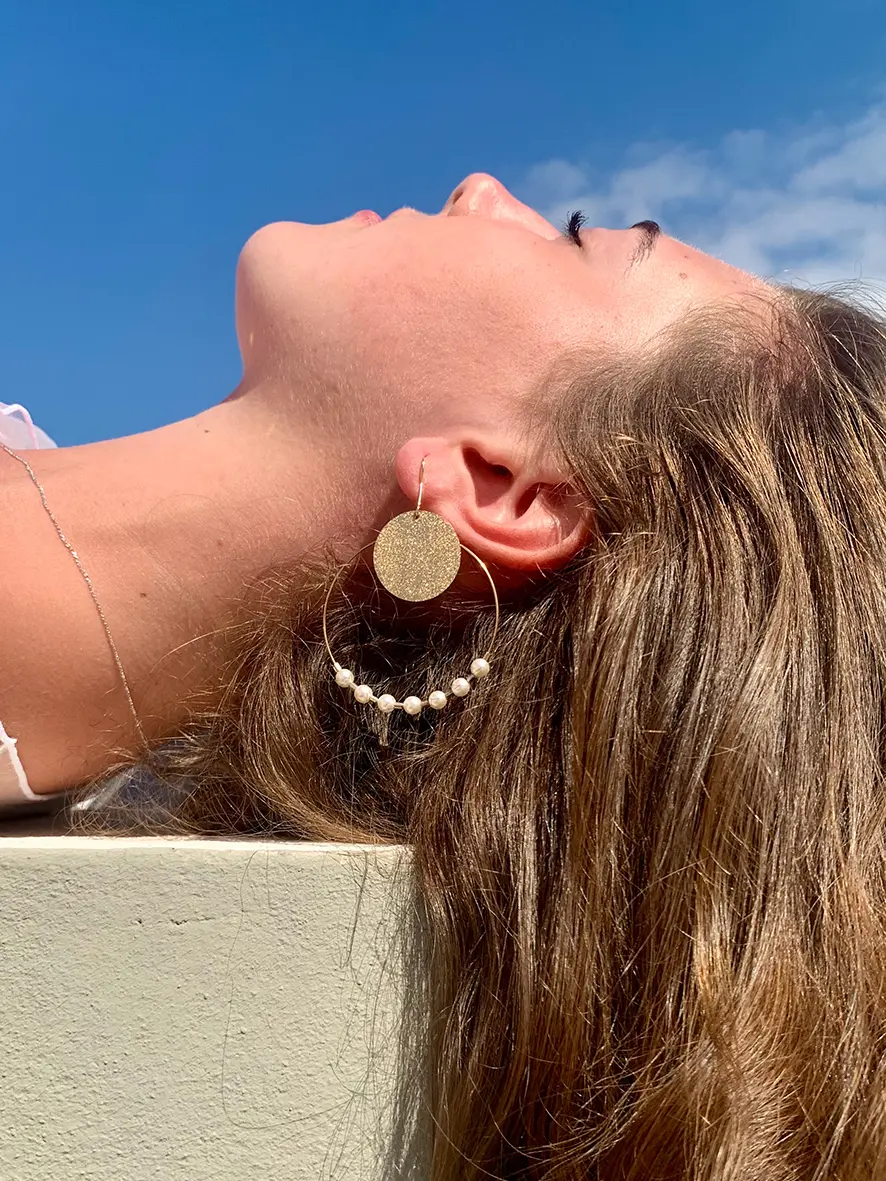 Prénommées Ilona , dérivé de « helê » en grec qui veut dire « éclat de soleil », ces créoles ornées de perles évoquent une petite constellation de planètes surmontées d’une médaille en soleil.