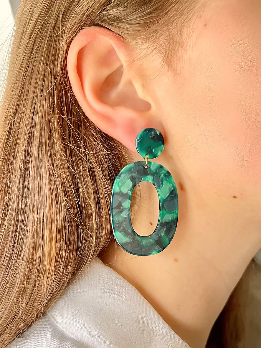 Une touche chic et tendance pour ces boucles d’oreilles avec un grand maillon ovale en acétate vert, avec sa puce d’oreille coordonnée.