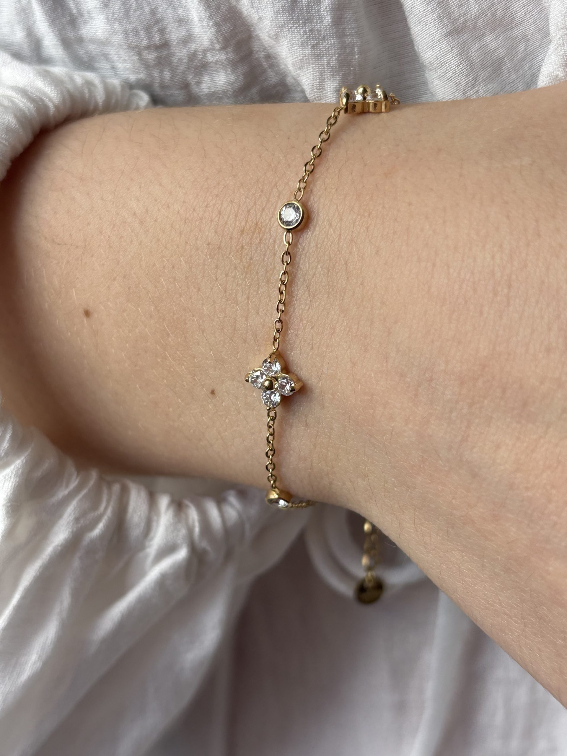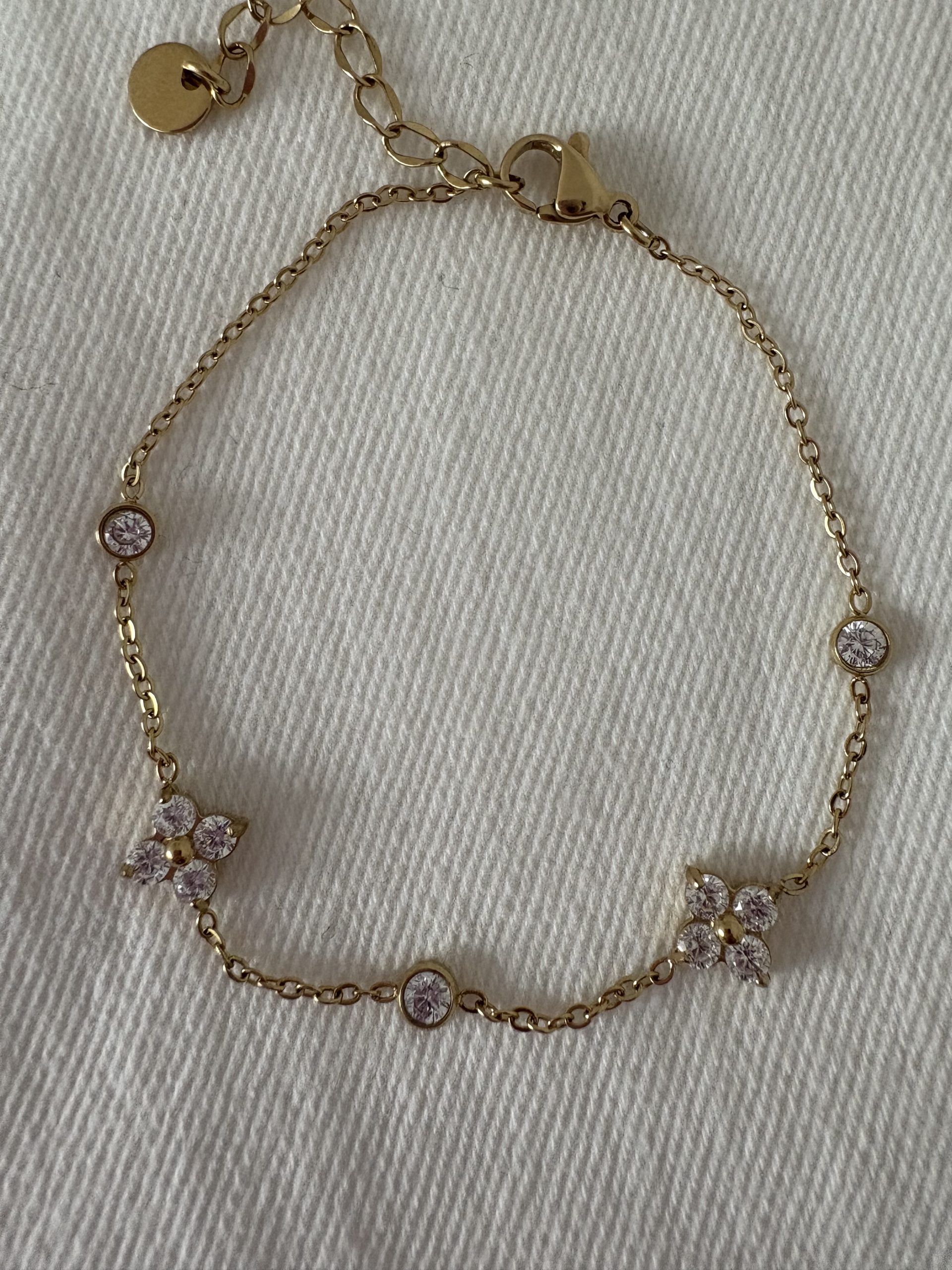 Élégant bracelet fin doré en acier inoxydable avec délicates fleurs en strass. Fermoir sécurisé, longueur ajustable.