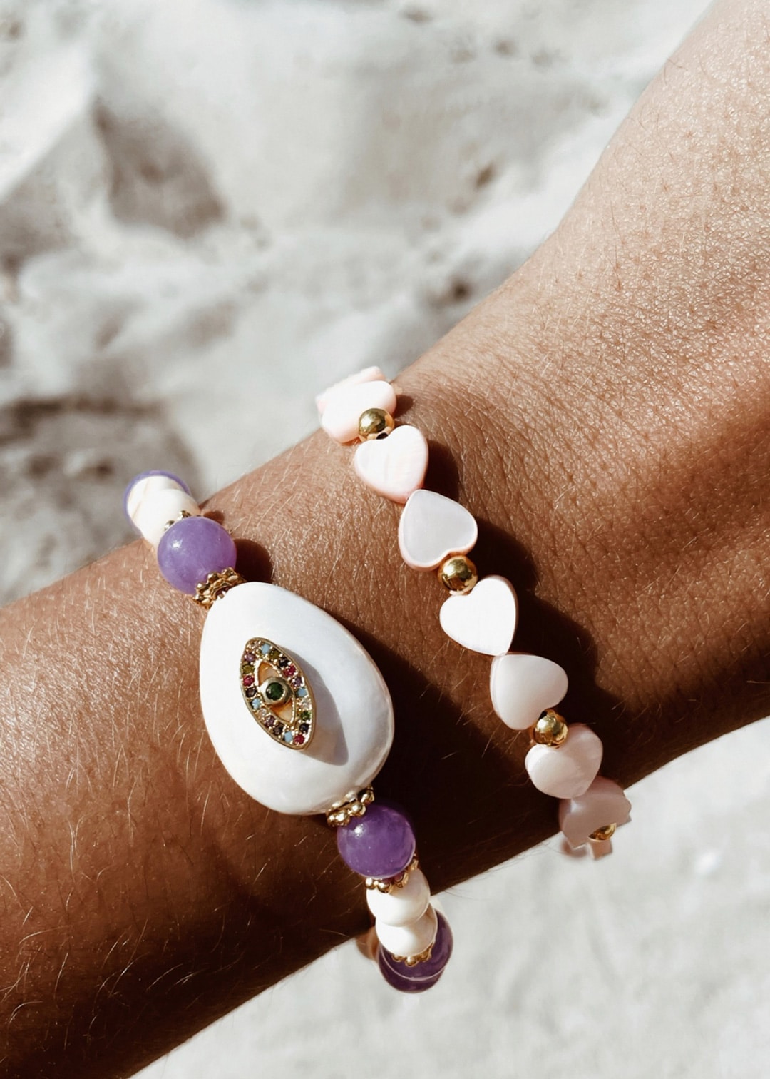 Bracelet en perle de jade lavande et coquillage naturel. Perle goutte coquillage blanc nacrée avec oeil en zirconium. Création française.