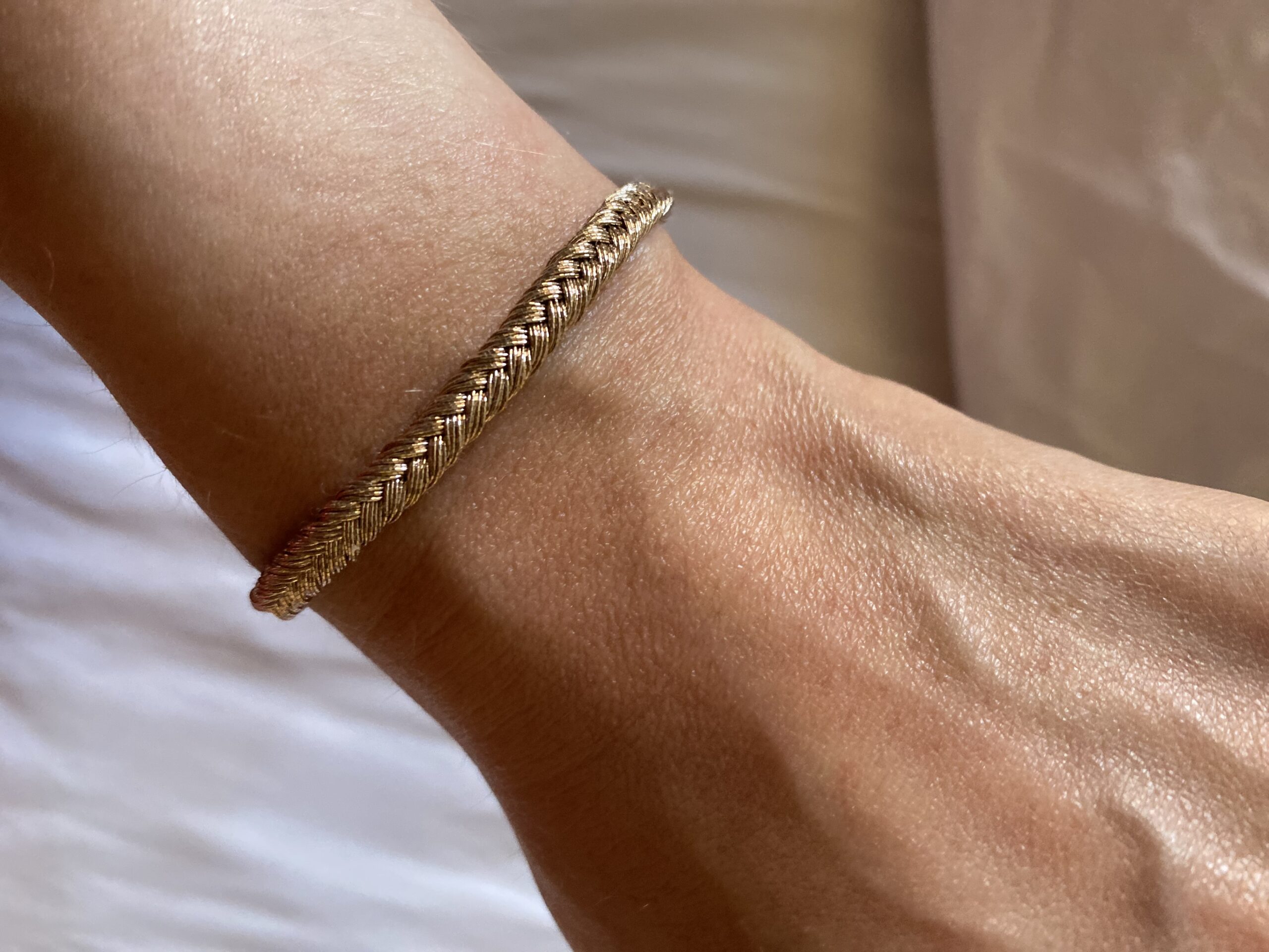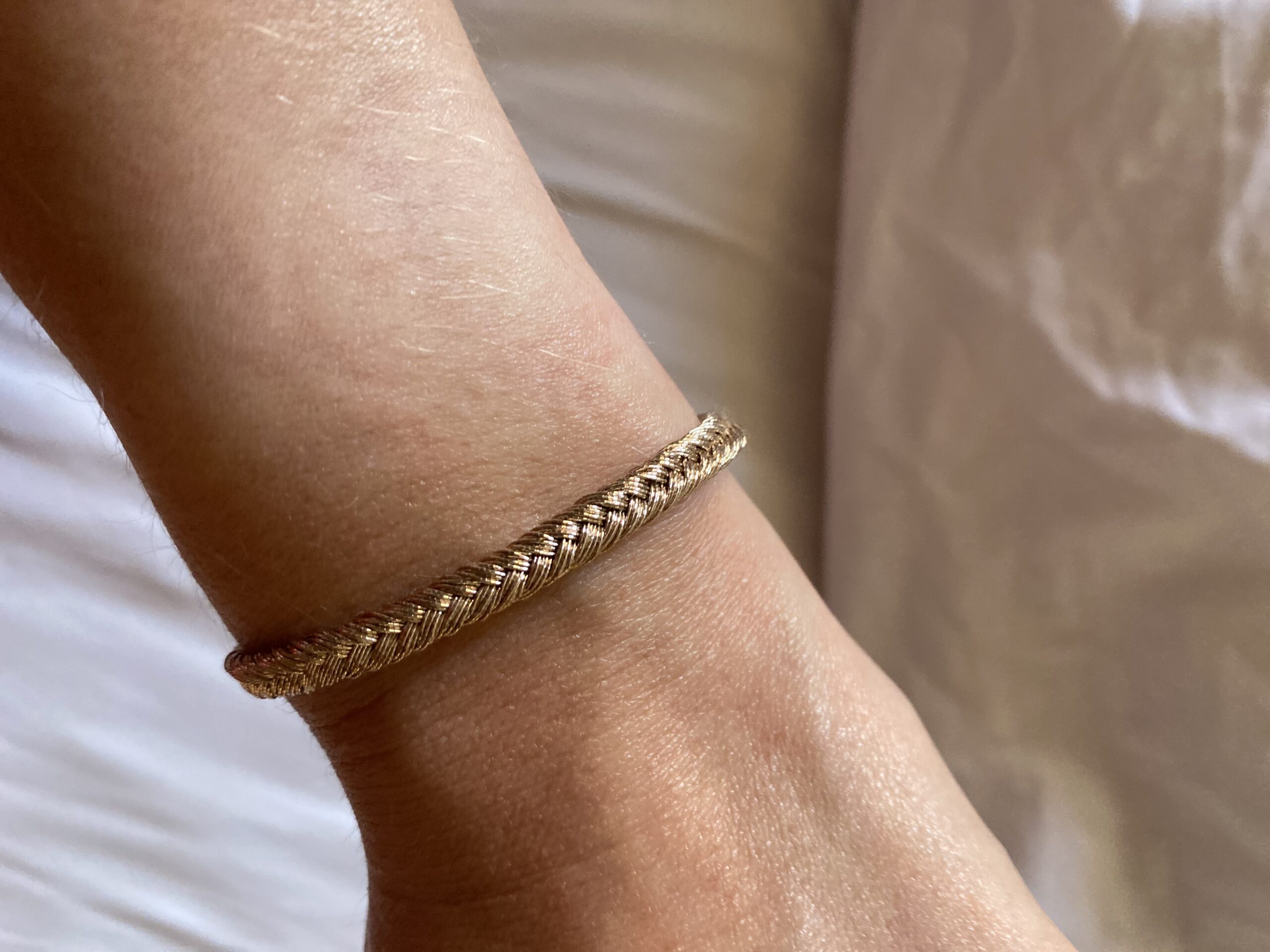 Ajoutez une touche d’élégance intemporelle à vos tenues avec notre bracelet en soie, tressée rose gold. Confectionné à la main avec un savoir-faire raffiné, ce bijou allie finesse du tissage et brillance subtile. Parfait seul ou en accumulation. Pièce unique.