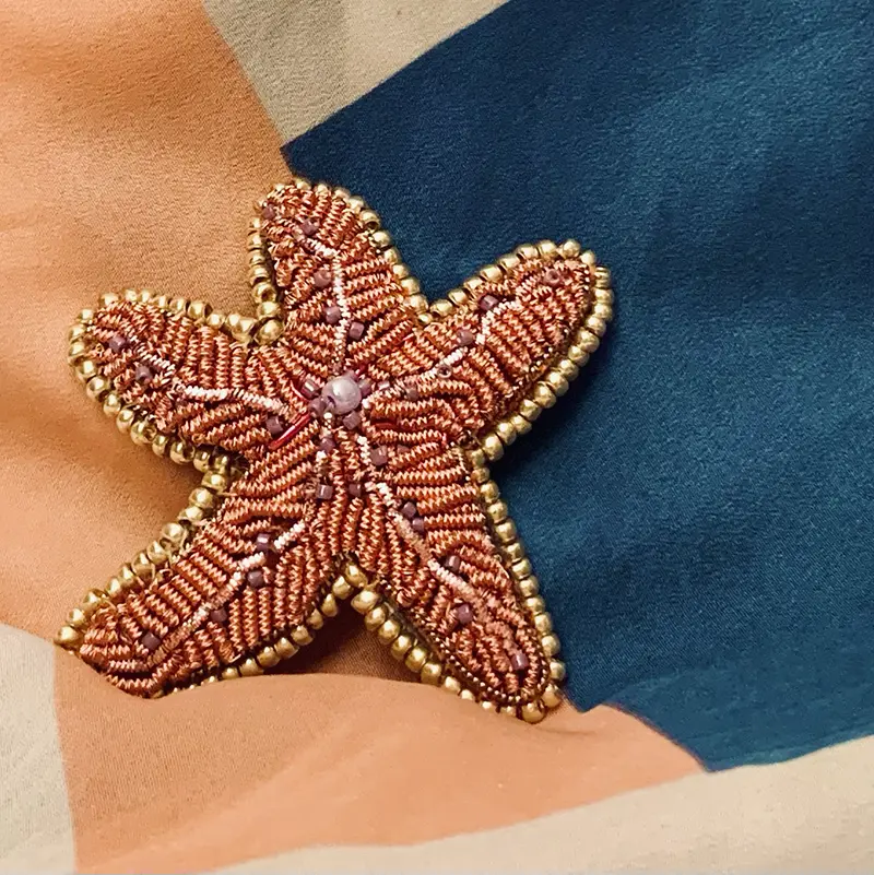 Comme une évocation marine, cette broche brodée en Étoile de mer ira aussi bien sur le revers de votre veste que sur un chapeau ou encore sur un foulard.