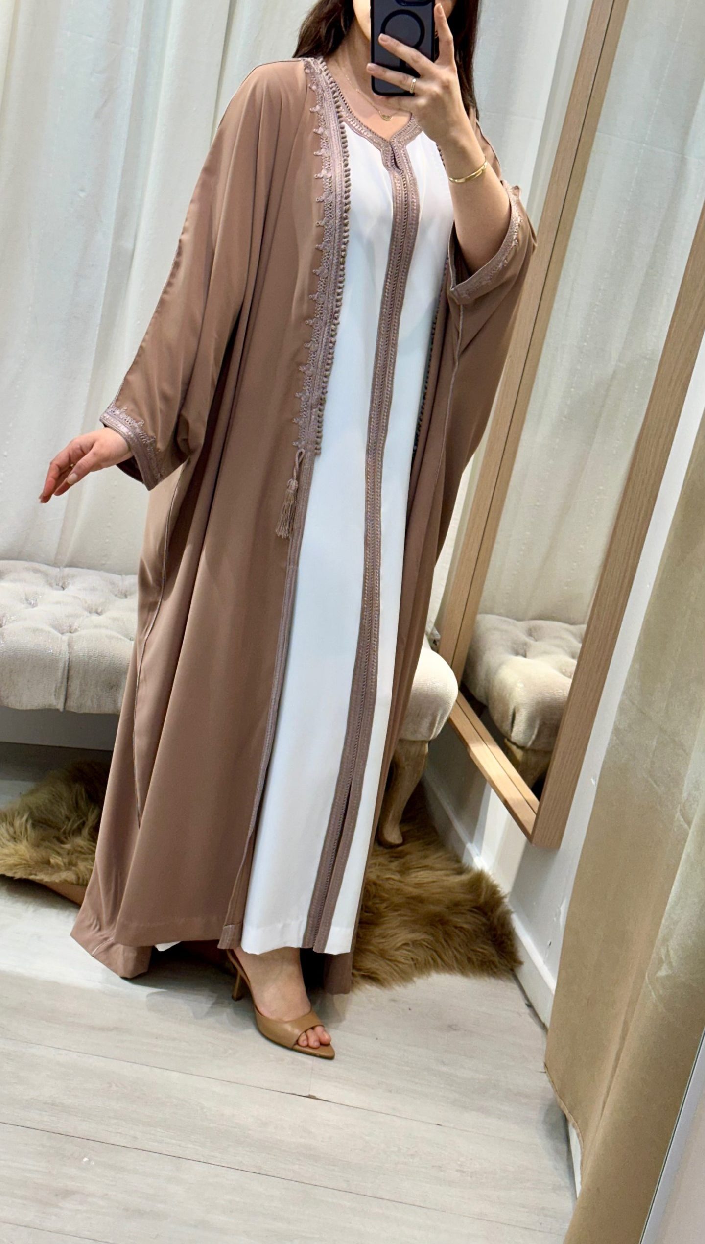 - Caftan très large en taupe rosé avec sfifa/passementerie et deux chouchas devant.