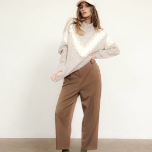 -Le mannequin porte la ceinture avec la jupe marron chiné Lili, le gilet lulu et les bracelets suivants : bracelet perles coquilles de nacre oeil rouge et bracelet perles pierre de lune Luck.