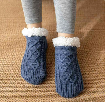 Chaussettes courtes antidérapantes en coton de couleur bleu avec fourrure (T. 35 à 39)