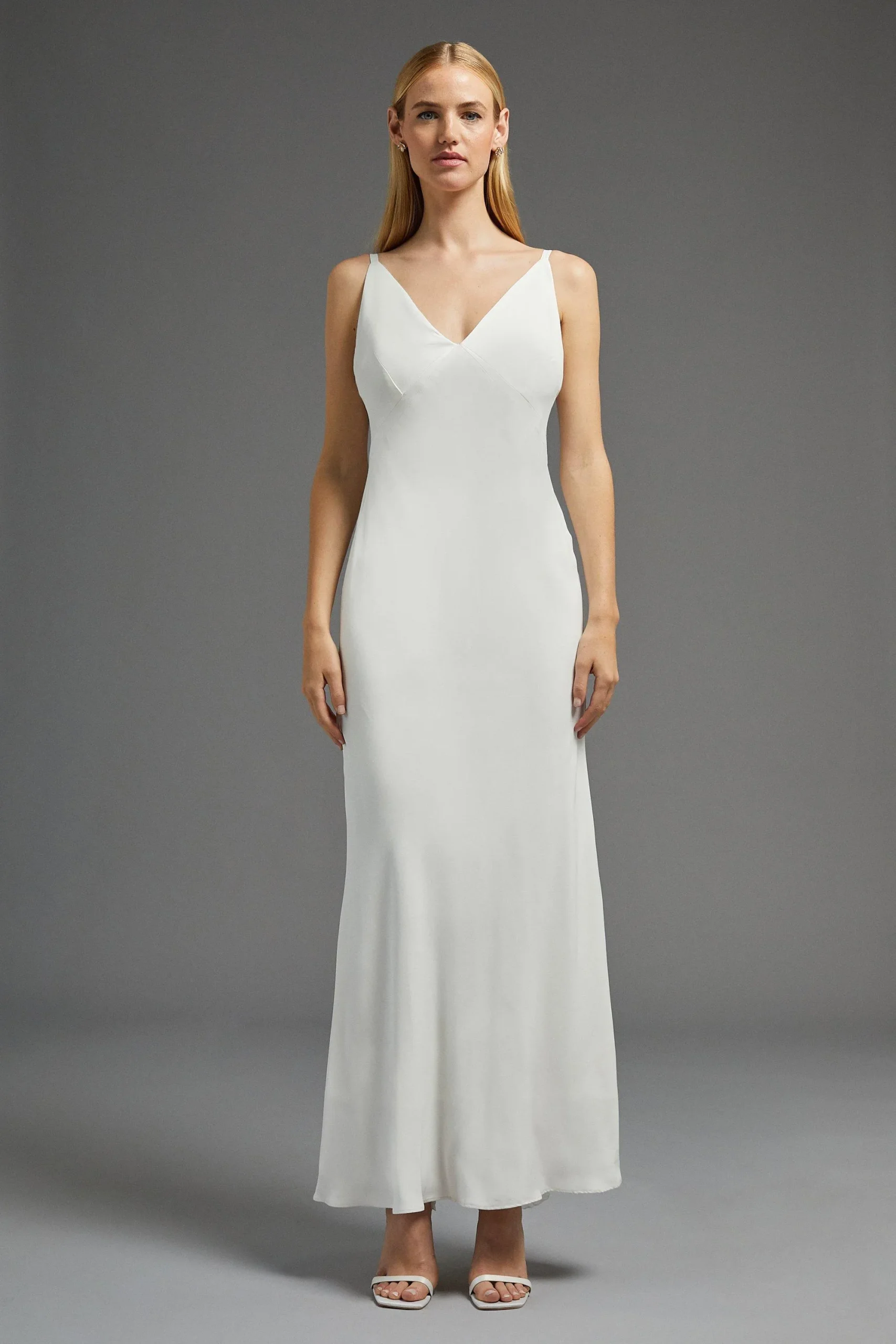 Create a bespoke bridal look with this wedding dress. As part of our bridal separates collection, the piece can be worn individually or together with the rest of the collection. Perfect to be used as a base layer, the dress is designed with a fitted shape, V-neckline and maxi length.