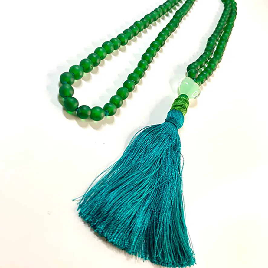 Tout en simplicité et en gaieté, ce long collier sautoir en perles de verre recyclé à l’effet givré est orné d’une perle Coeur vert d’eau et d’un pompon grigri vert flashy.