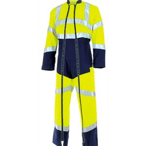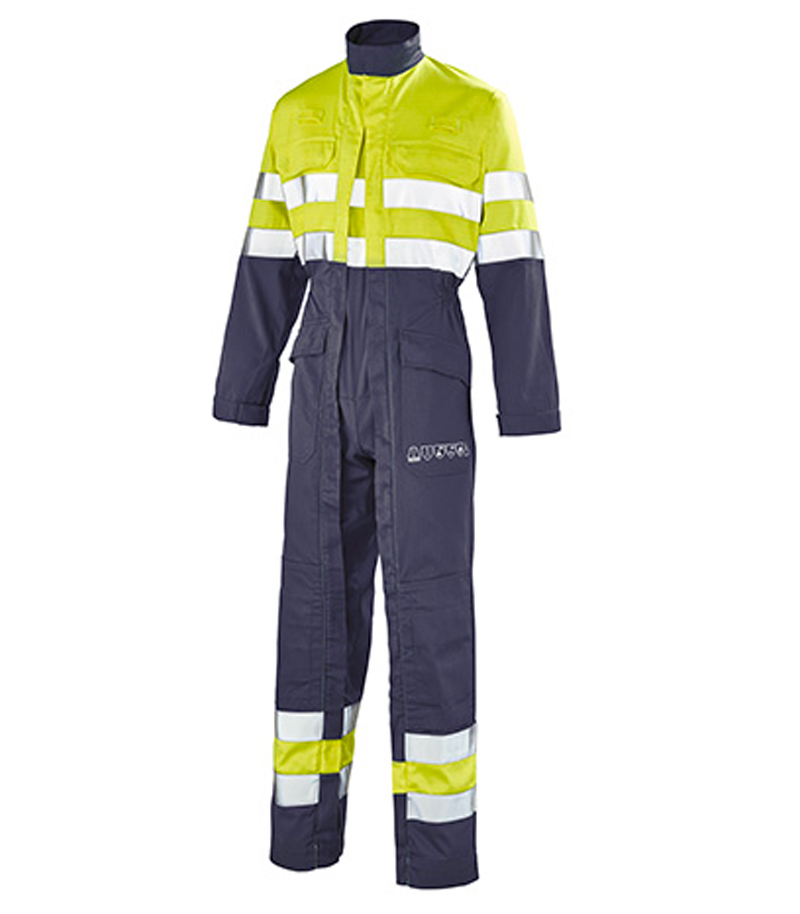 Tissu : 50% Polyester – 49% Coton – 1% Fibre antistatique – 260 gr. Col montant. Fermetures à glissière sous-patte. 2 passants portes dosimètres. 2 poches poitrine, 2 poches basses et 1 poche mètre avec rabats fermés. Poches genoux. 1 poche dos avec rabat fermé. Poignets à soufflets fermés. Bandes rétro-réfléchissantes. Collerette de marquage.