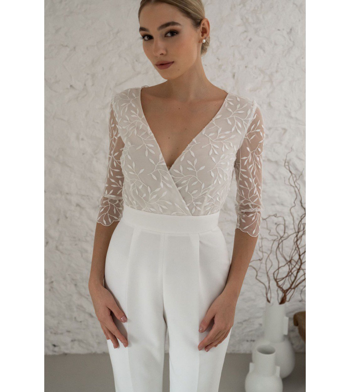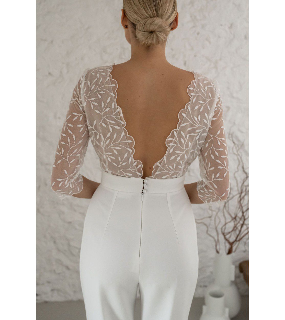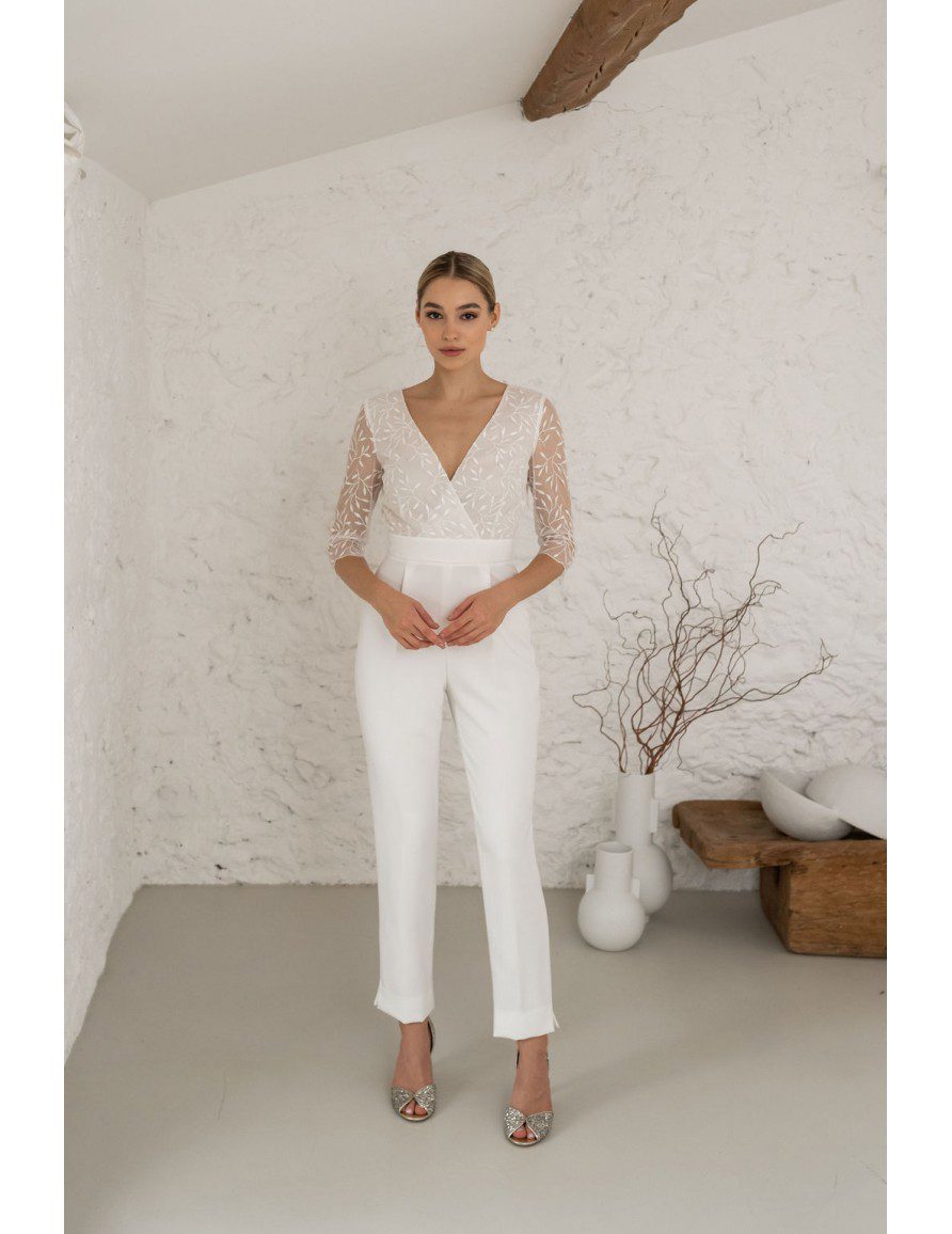 Sublime combinaison pantalon de mariée V devant et dos nu, en crêpe et en tulle brodé français. Il est léger et au style japonisant. Le buste présente un portefeuille opaque et un dos profond qui fera chavirer son coeur. Les manches 3/4 sont légères et ajustées. Le pantalon cigarette dévoile subtilement la cheville. Pantalon opaque. Ne comporte pas de poches. Longueur pantalon 97cm et 6cm d’ourlet intérieur