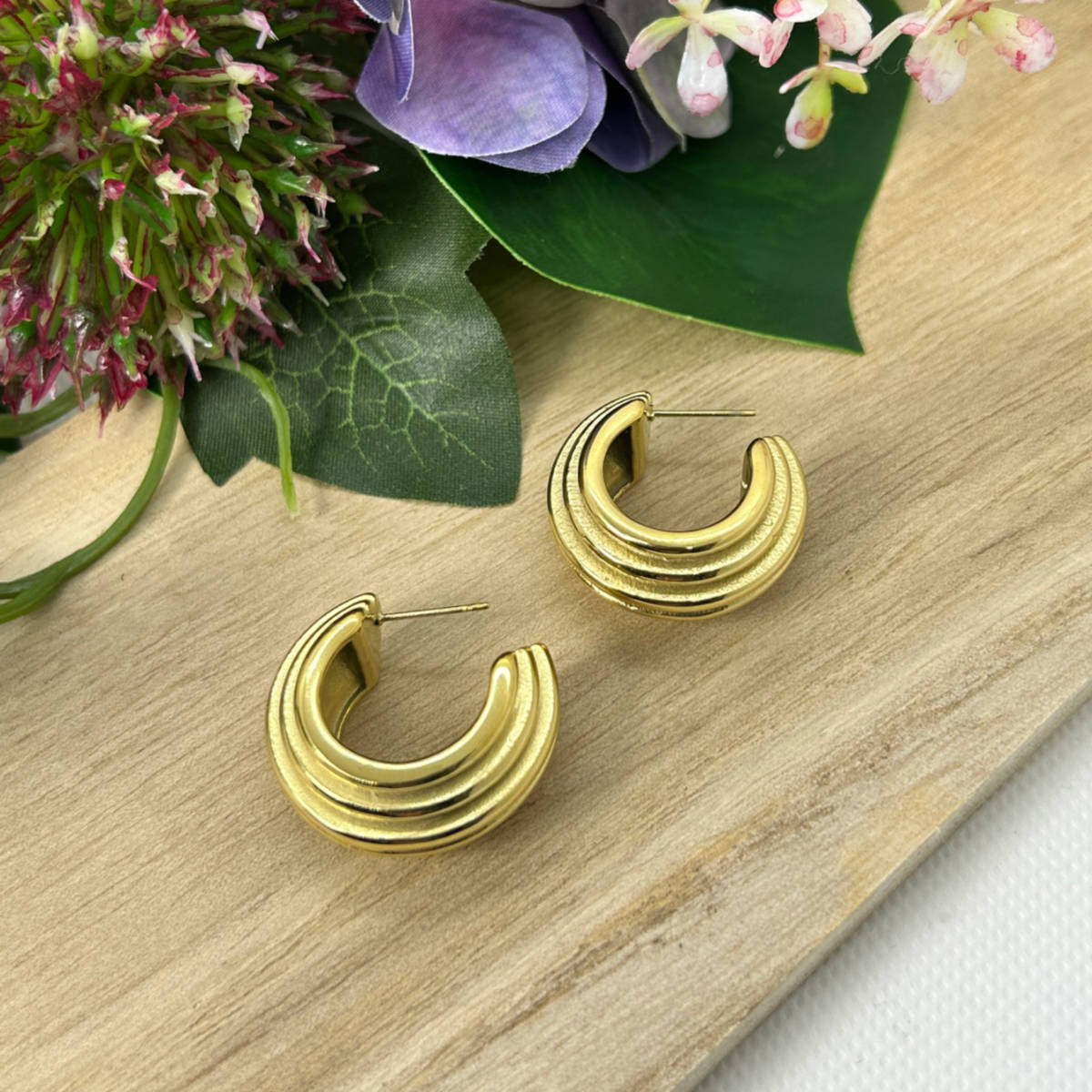 Laissez-vous séduire par ces créoles rayées dorées en acier inoxydable. Idéales pour créer de jolis looks modernes .