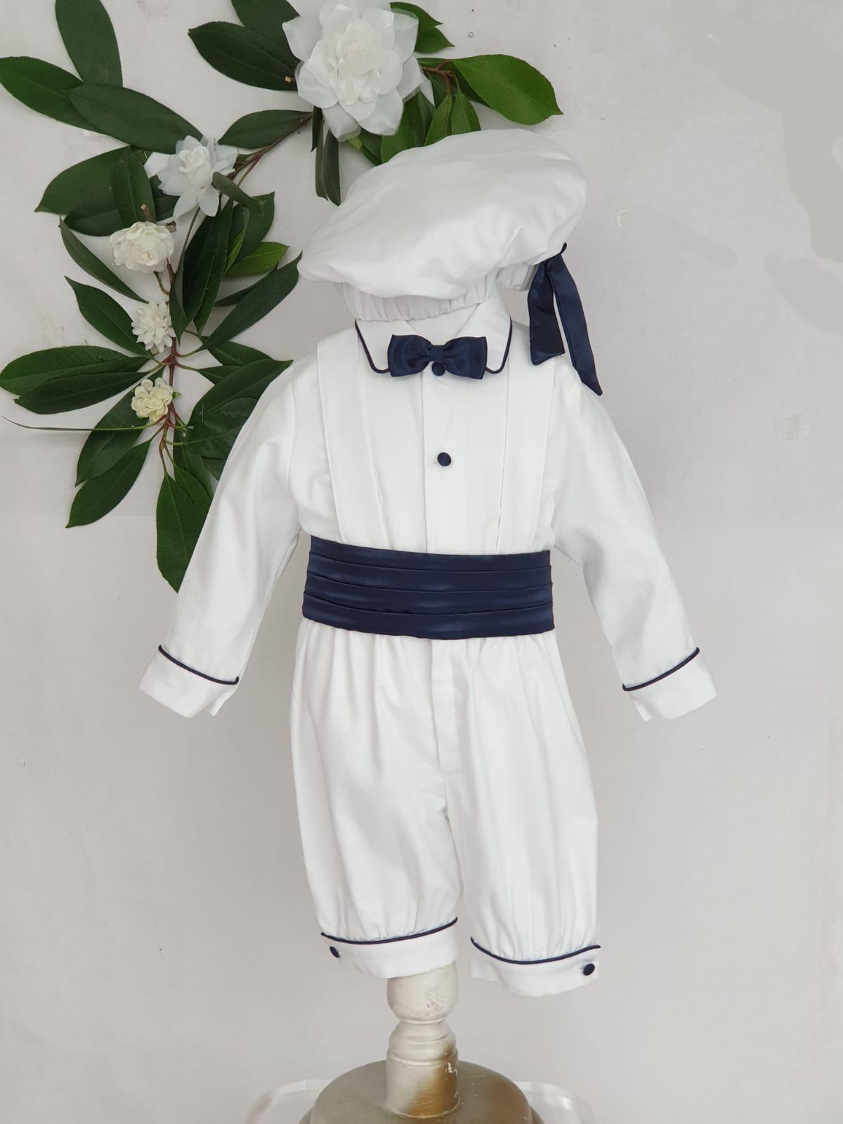 Ensemble Sachat blanc et marine ceinture marine et béret 115 euros knickers chemise en pique de coton béret assorti ceinture et noeuds en satin marine fabrique en France dans nos ateliers parisiens