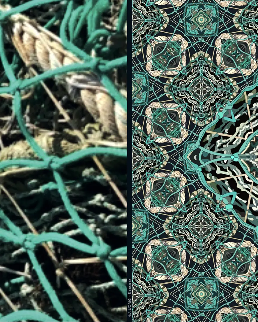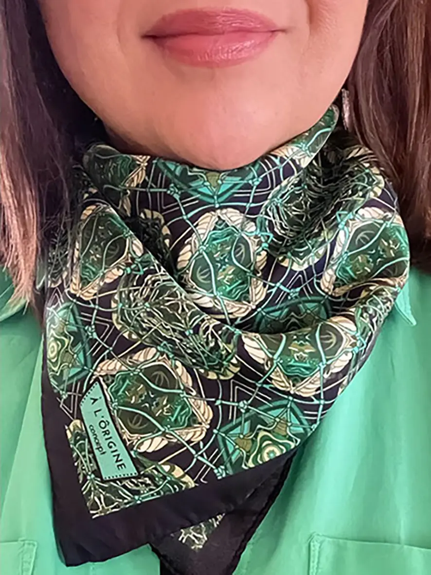 Avec le motif Filet de pêche, ses couleurs de vert émeraude, vert vif et noir vous permettent de mettre en lumière vos tenues tout au long de l’année.
