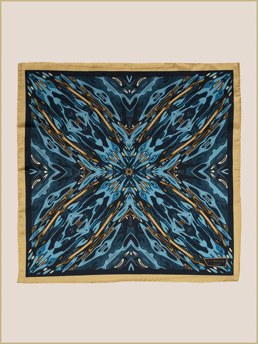 Tout en nuances de bleus et dorés, le foulard Clair de Lune s’accordera parfaitement avec une tenue en jeans, ou du camel, ou encore du blanc.