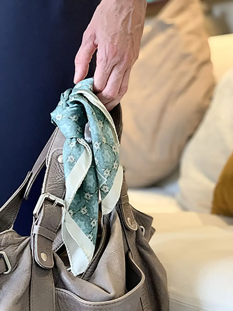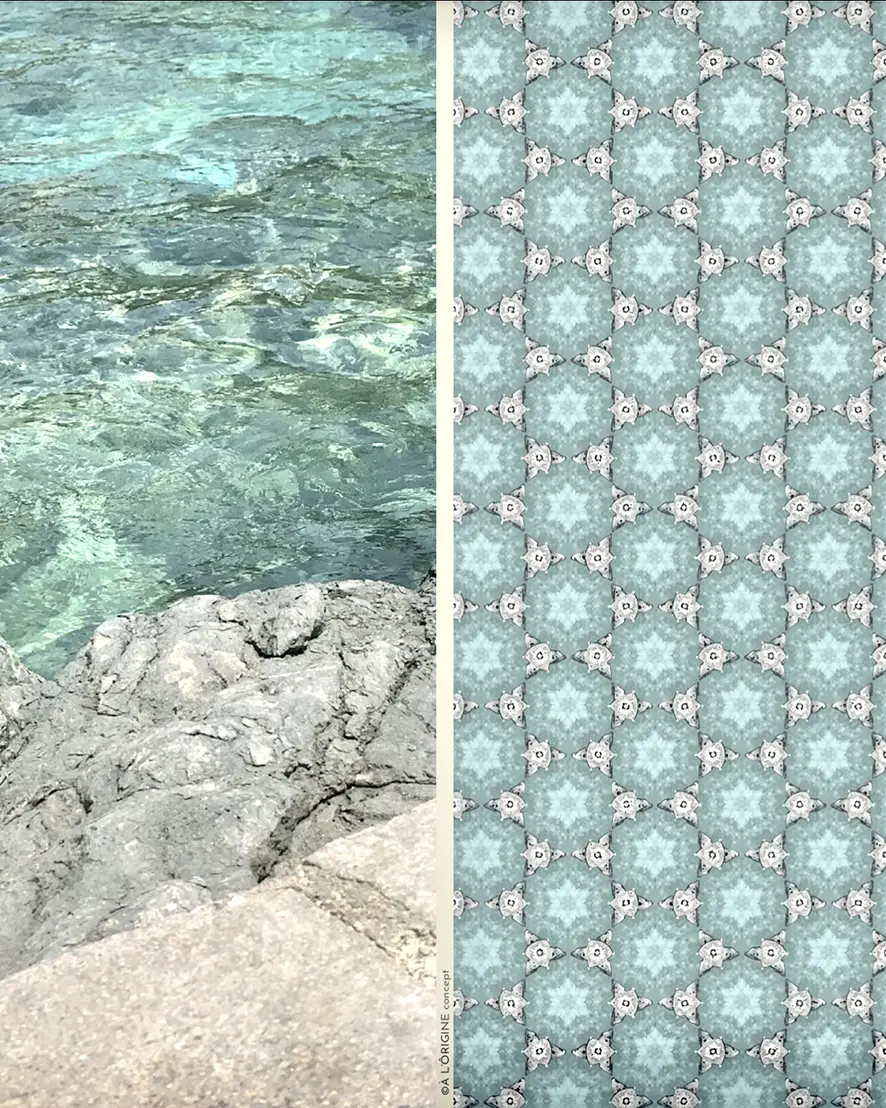 Avec le motif Roche au soleil, vous porterez à votre cou ou sur votre sac à la fois la luminosité et la douceur grâce au gris perle et au bleu céladon.