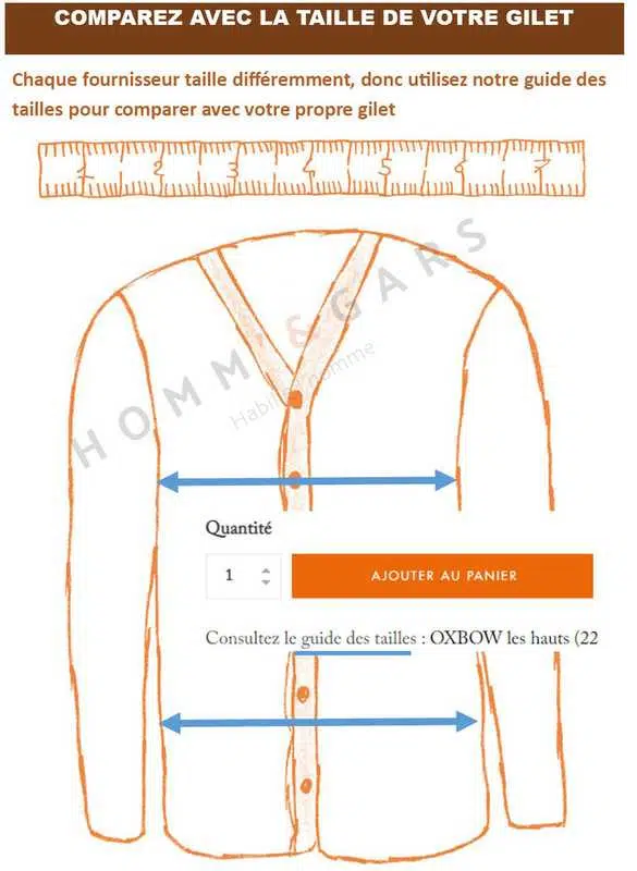 Guide des tailles de ce gilet, mesures prises à plat en centimètres