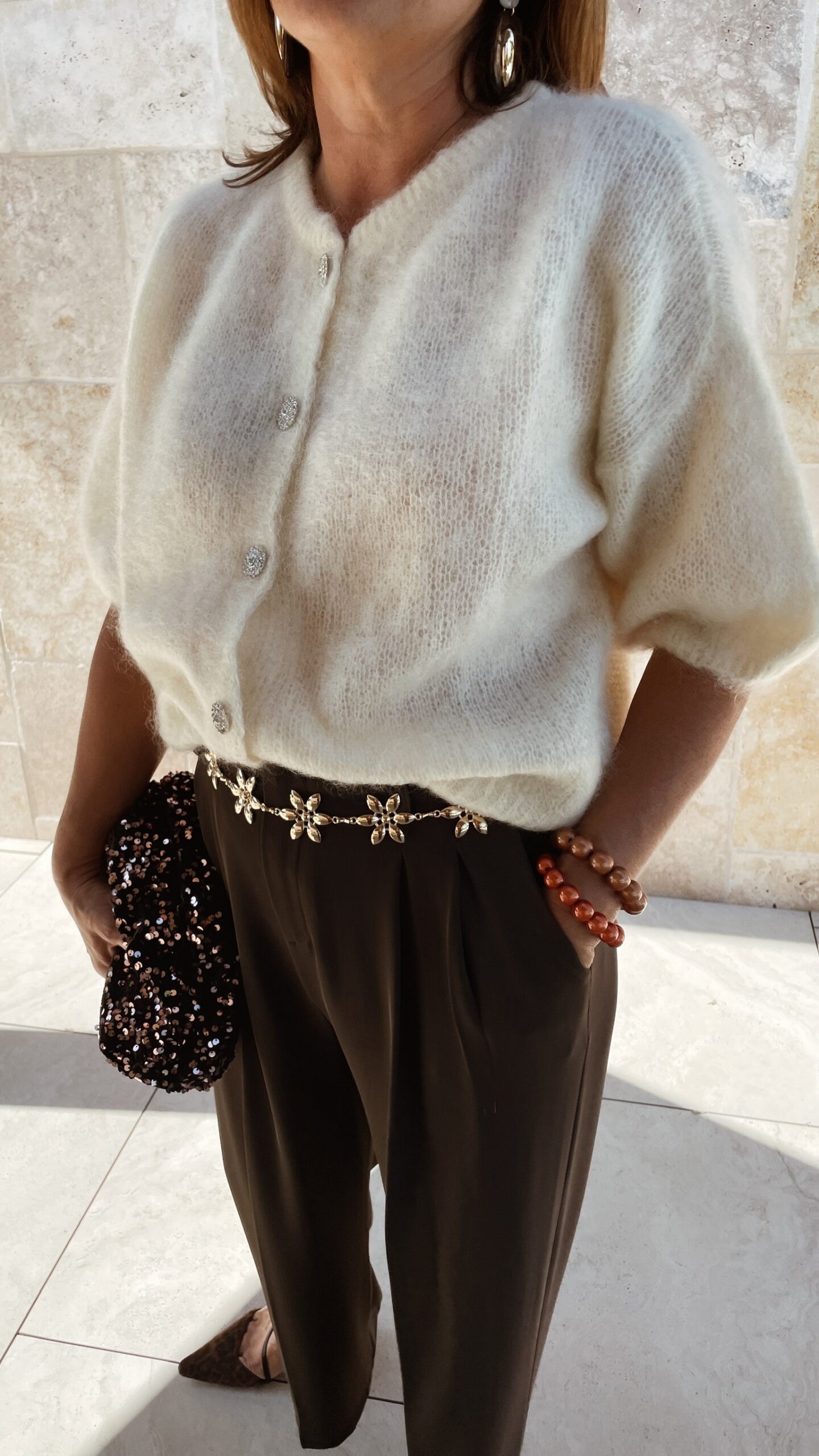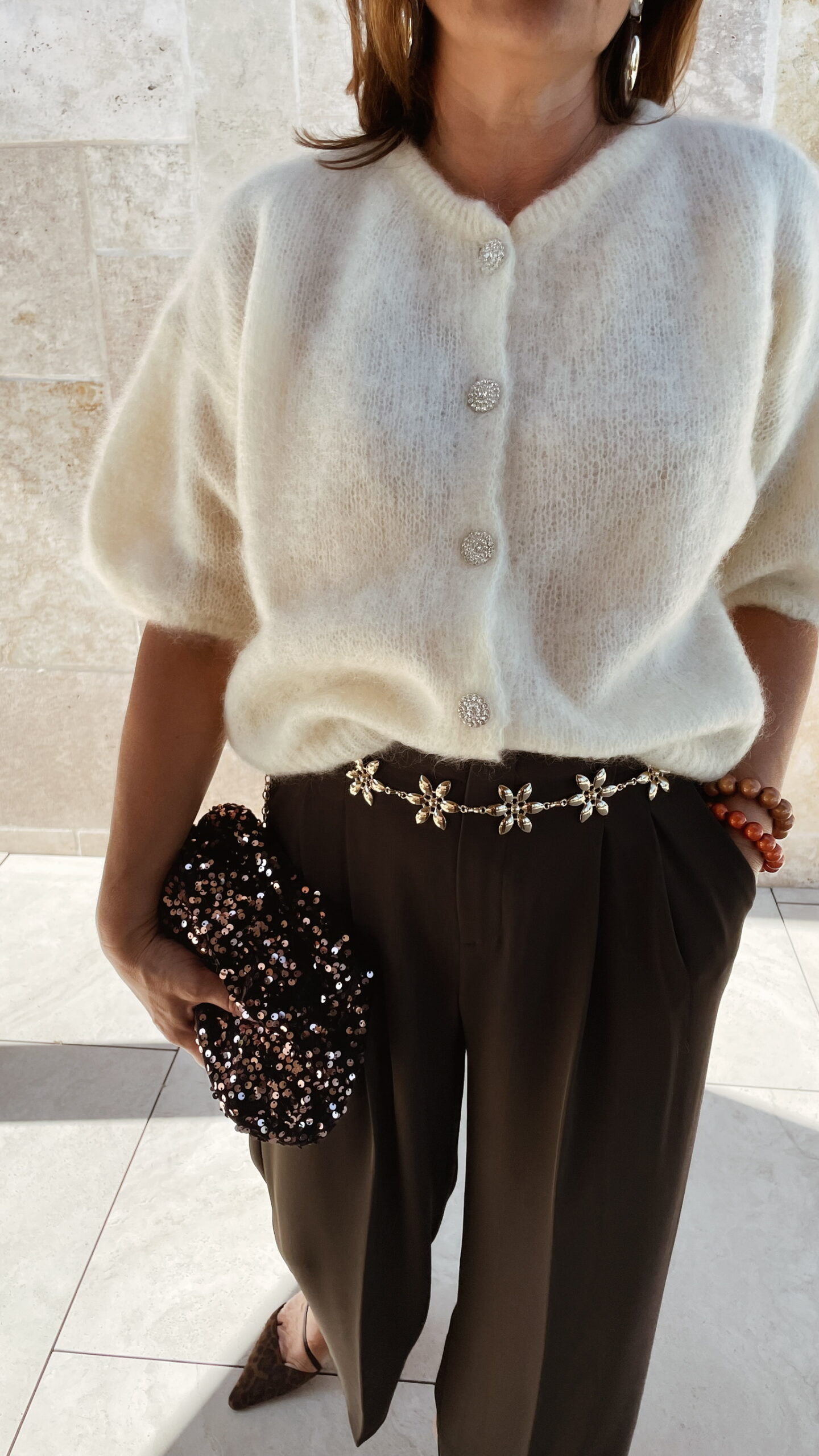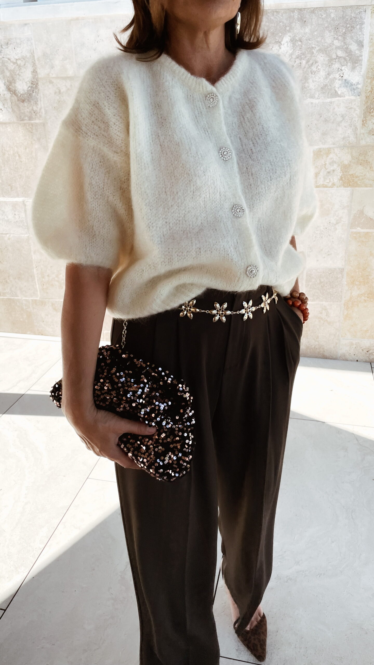 -Le gilet Ecru Gaspard est porté avec le pantalon marron Giorgio, le sac boum chocolat, la ceinture chaine dorée fleurs et le duo bracelet terracotta camel.
