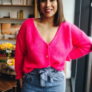 Notre gilet FOLK existe en plusieurs couleurs. Il se porte ouvert ou fermé avec les boutons nacré dans le dos. C’est une pure douceur.