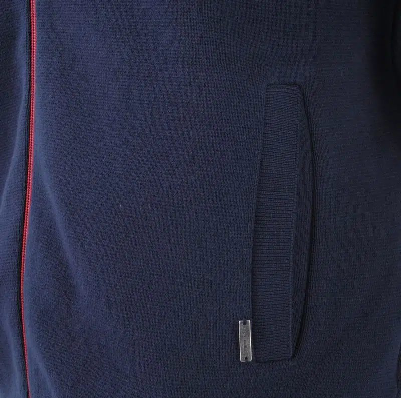 Un gilet à la fois classique par son ton marine et moderne par le zip rouge.